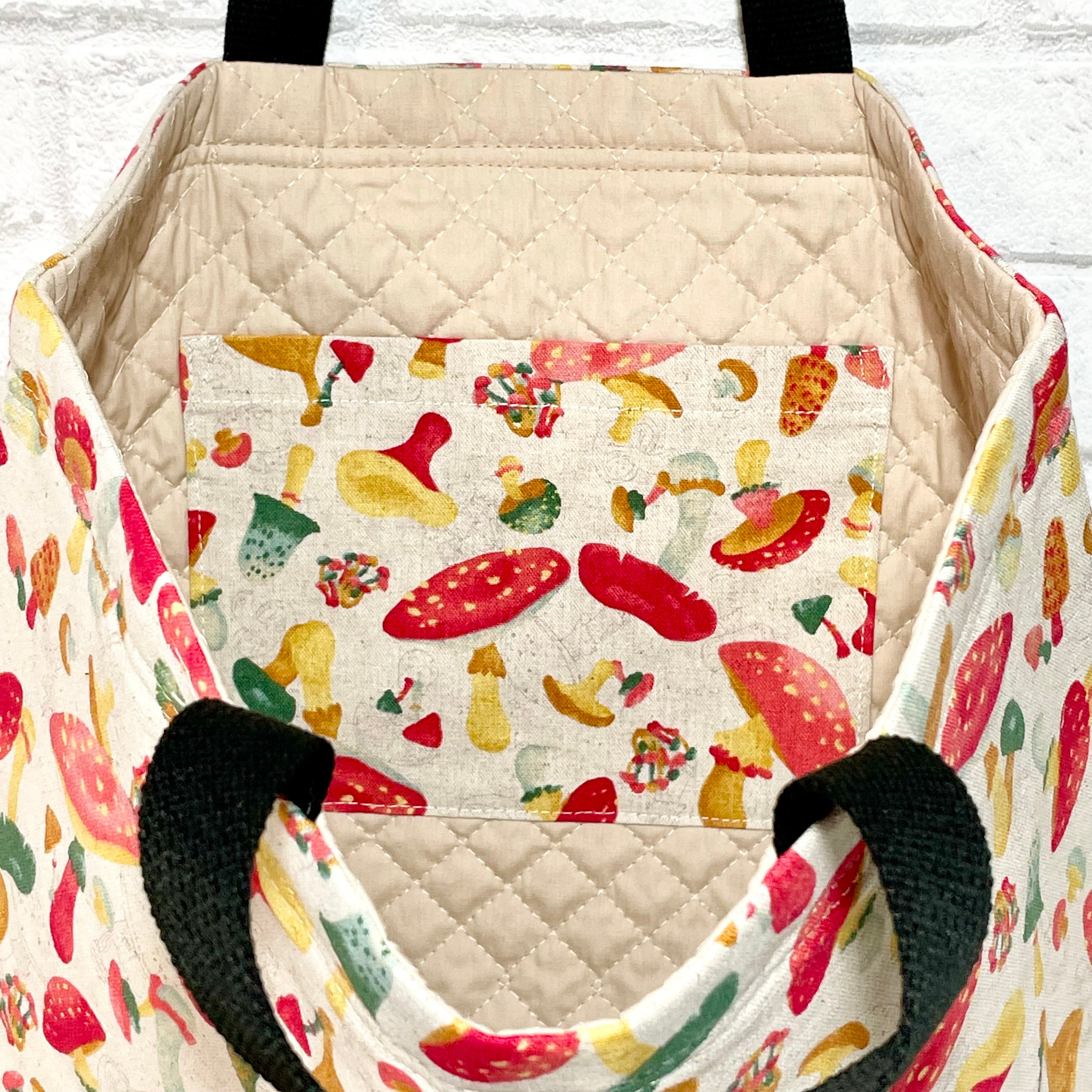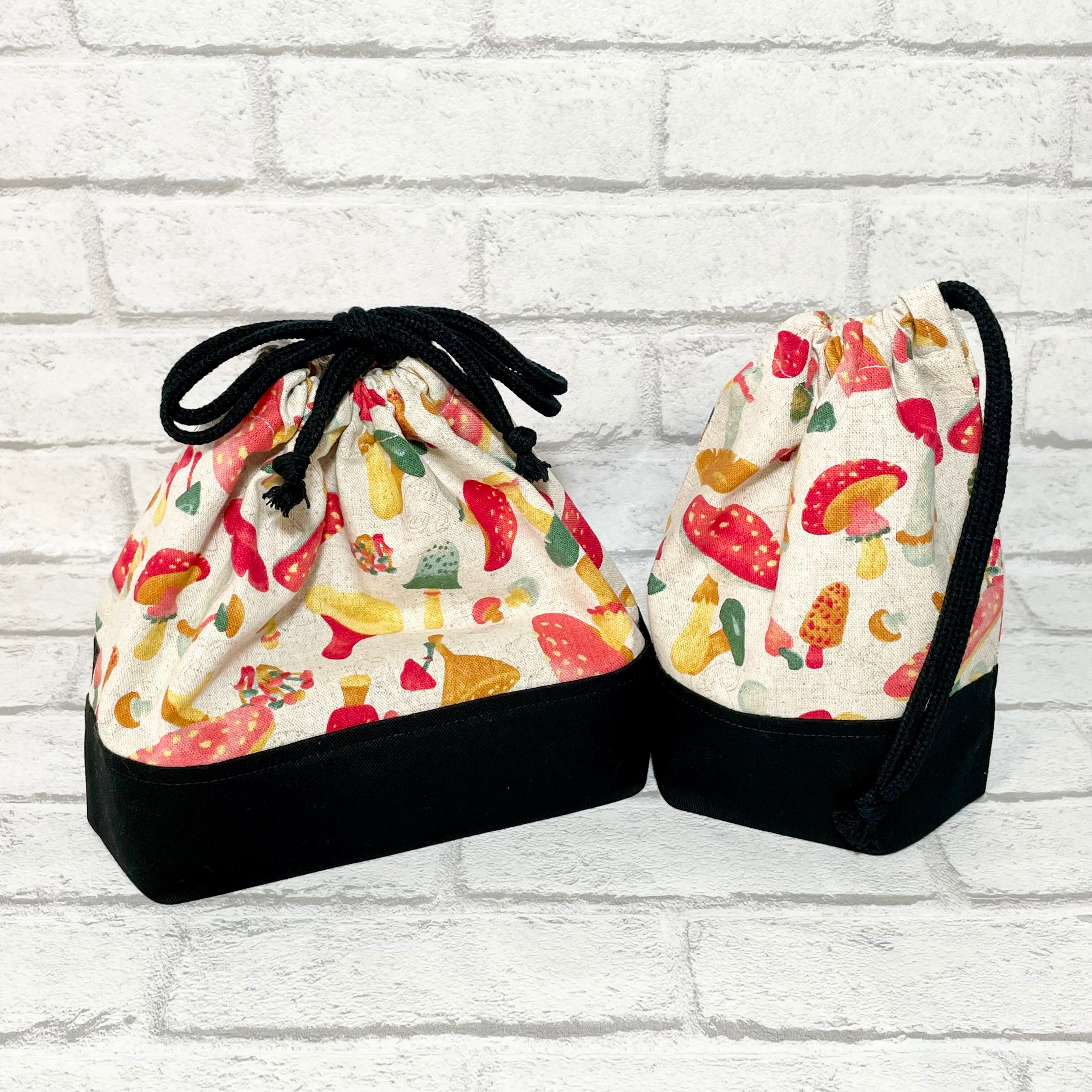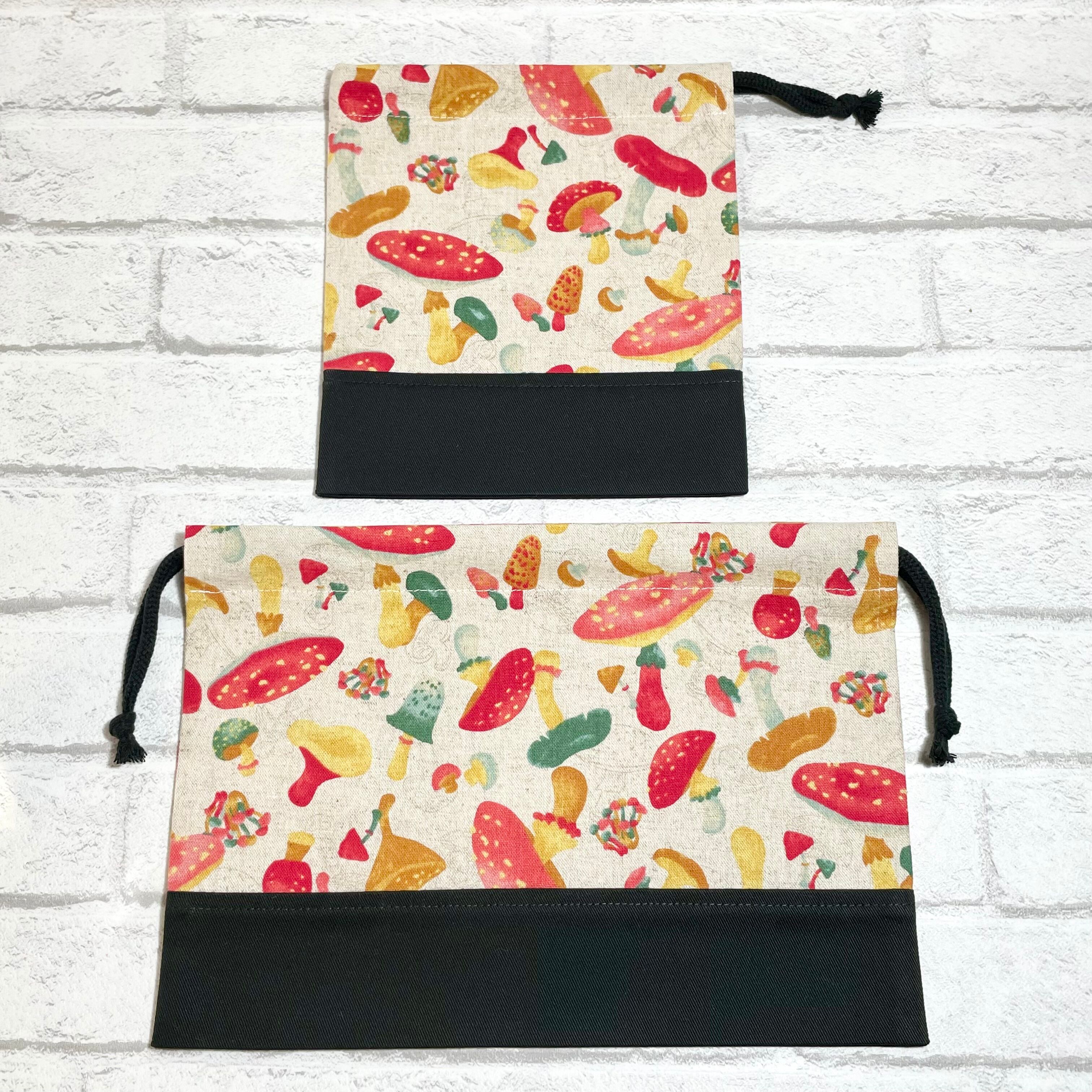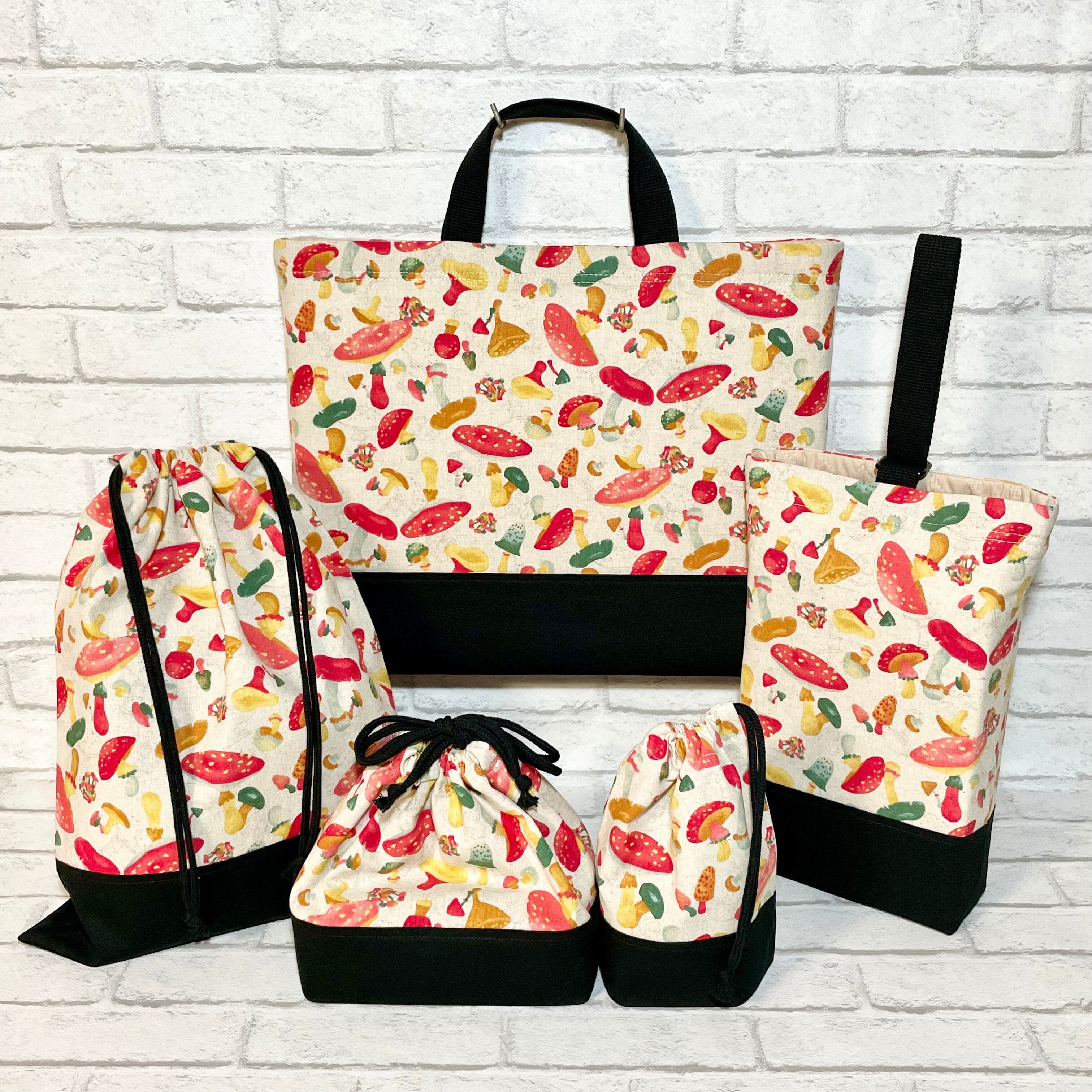 きのこだらけ(生成り赤)×黒 入園入学グッズ5点セット/裏地キルティング