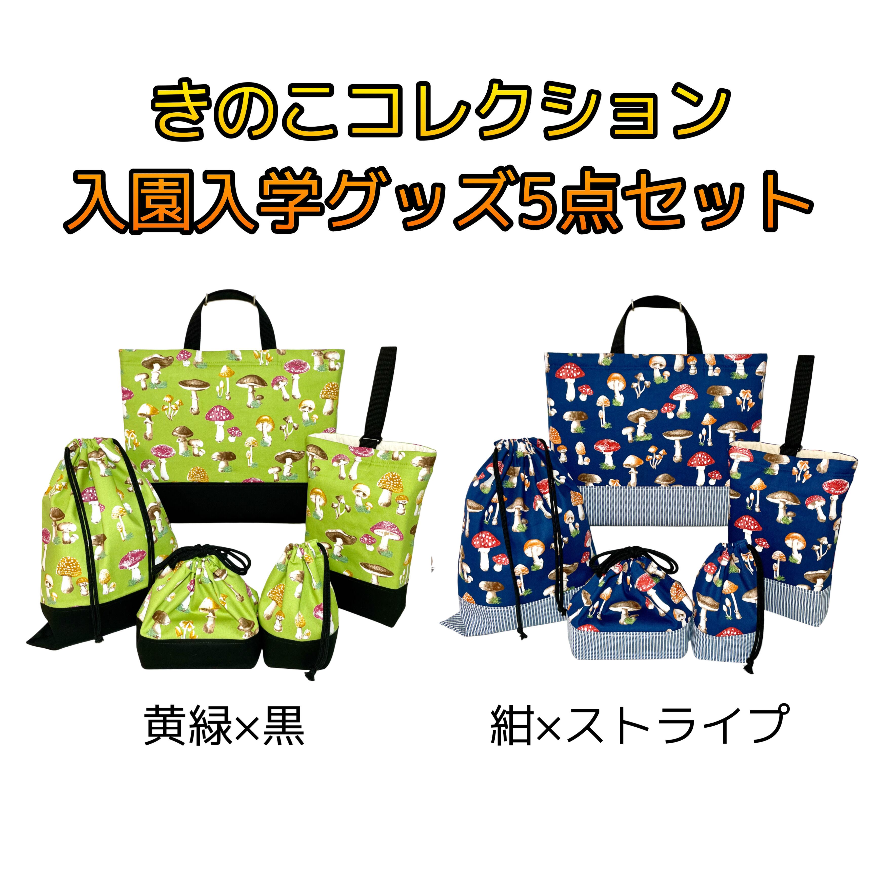 きのこコレクション(黄緑)×黒 入園入学グッズ5点セット/裏地キルティング