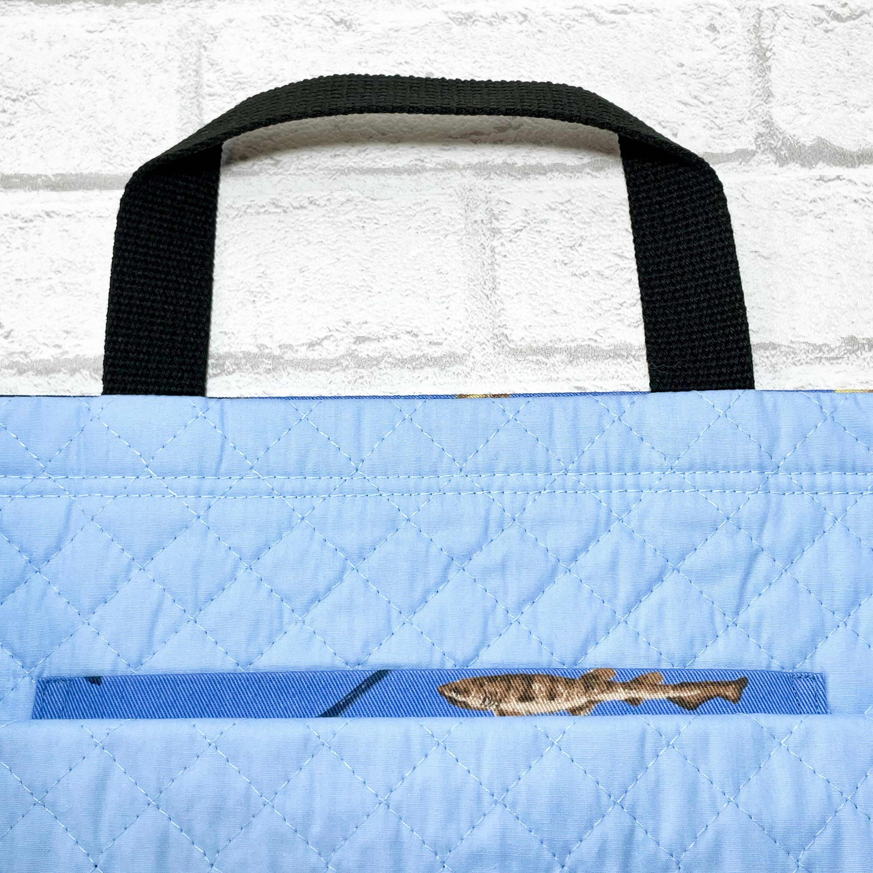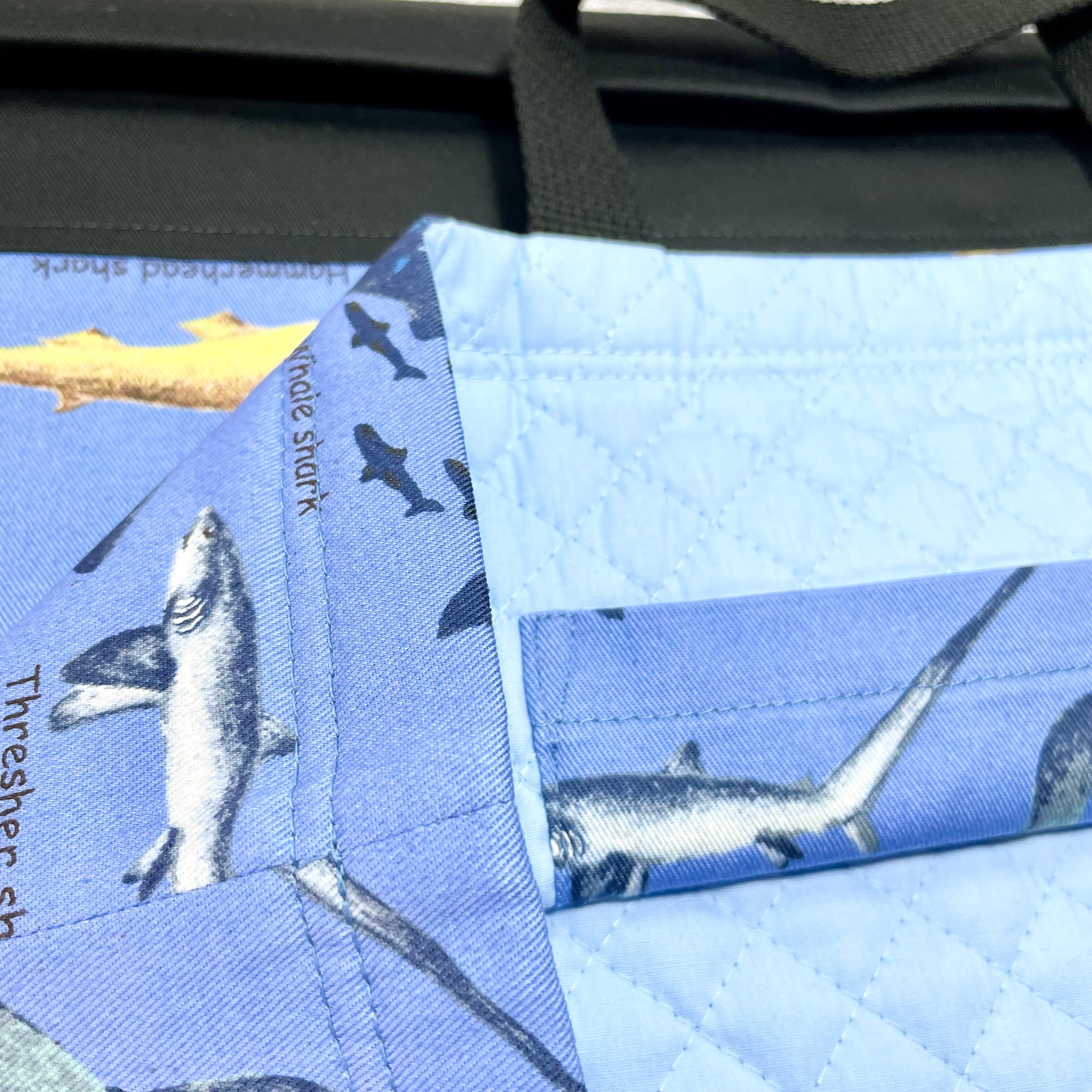 サメ図鑑(ブルー)×黒 レッスンバッグ/おけいこバッグ 裏地キルティング 40×30×4cm