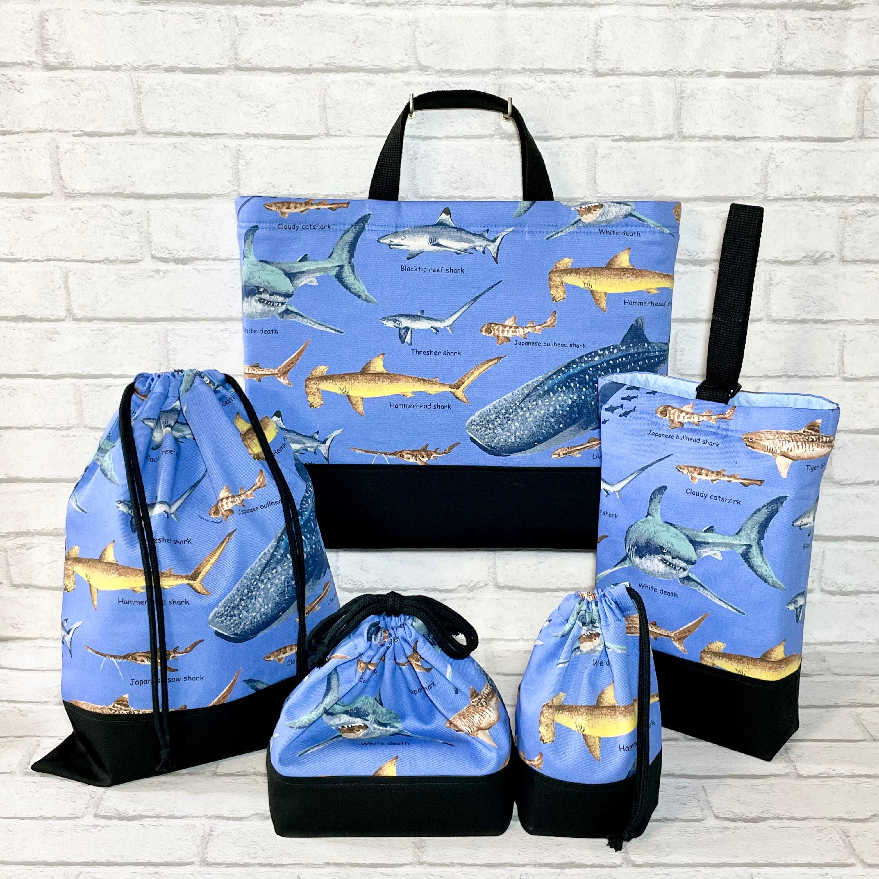 サメ図鑑(ブルー)×黒 持ち手付き体操着袋/おきがえ袋 38×30cm