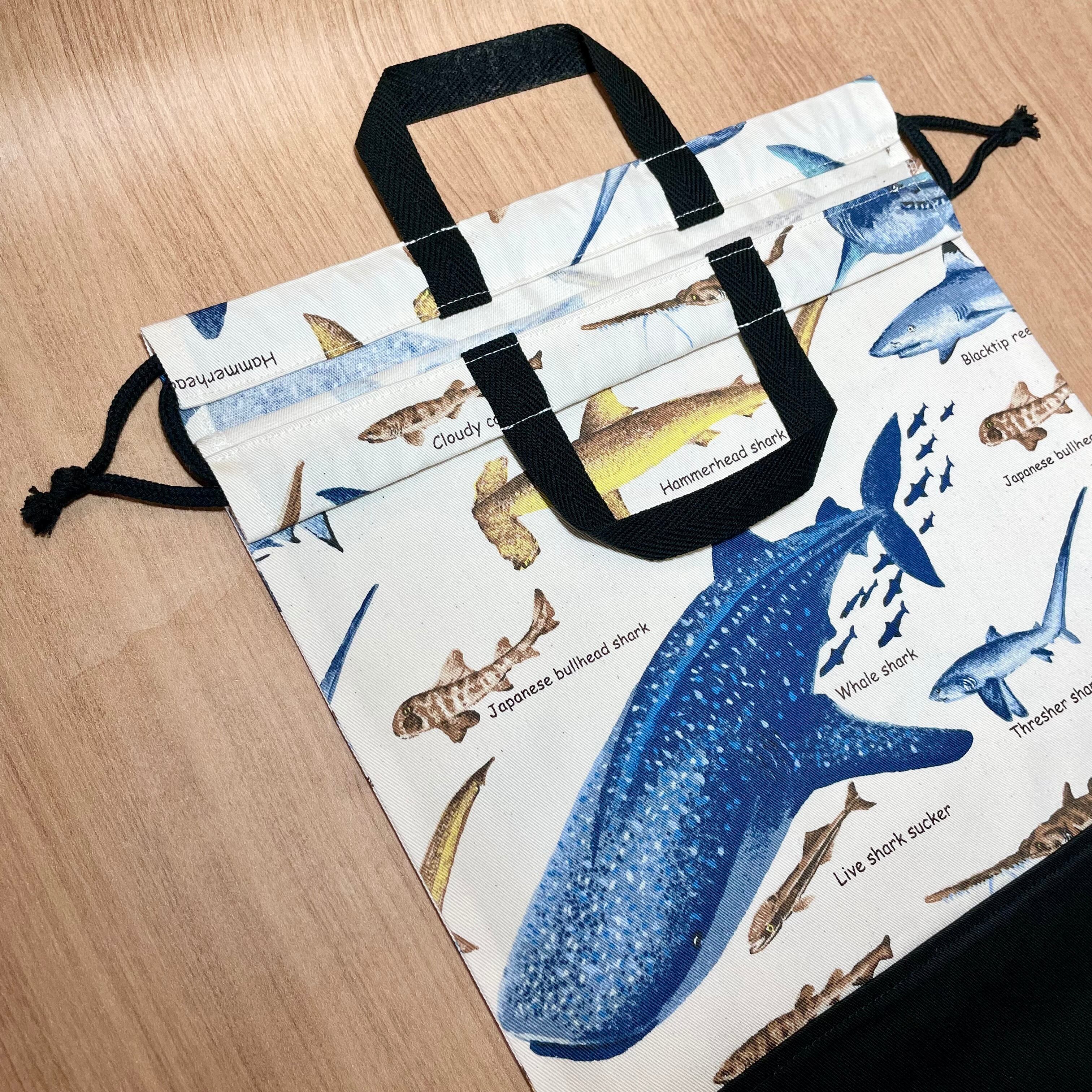 サメ図鑑(生成り)×黒 持ち手付き体操着袋/おきがえ袋 38×30cm