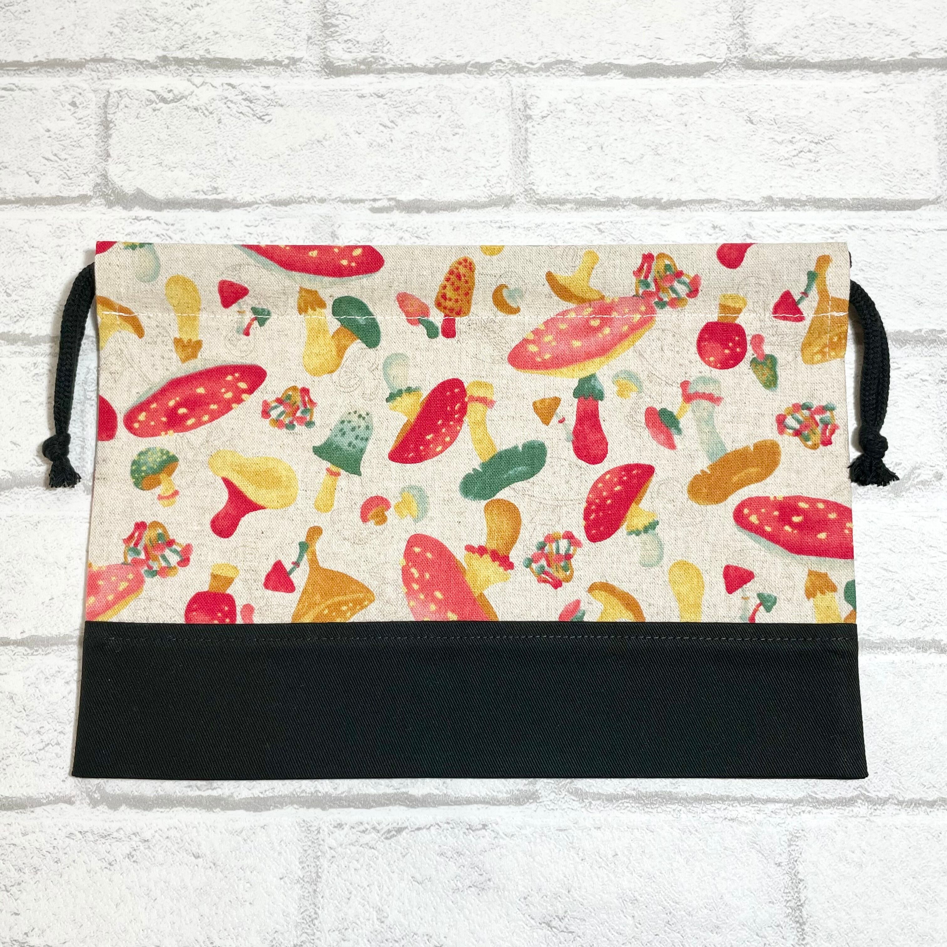 きのこだらけ(生成り赤)×黒 お弁当袋18×26×10cm