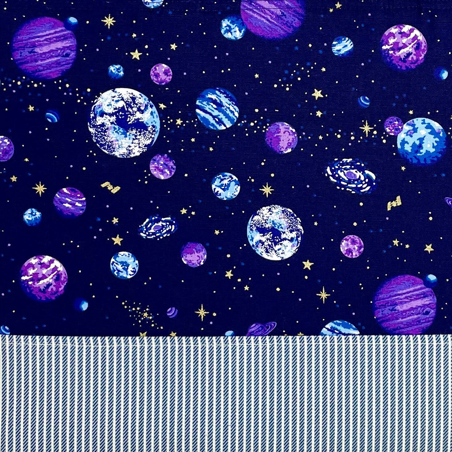 パープルを基調にした惑星柄とストライプの組み合わせは、華やかでありながらも落ち着いた印象を与え、おしゃれな雰囲気を演出します。