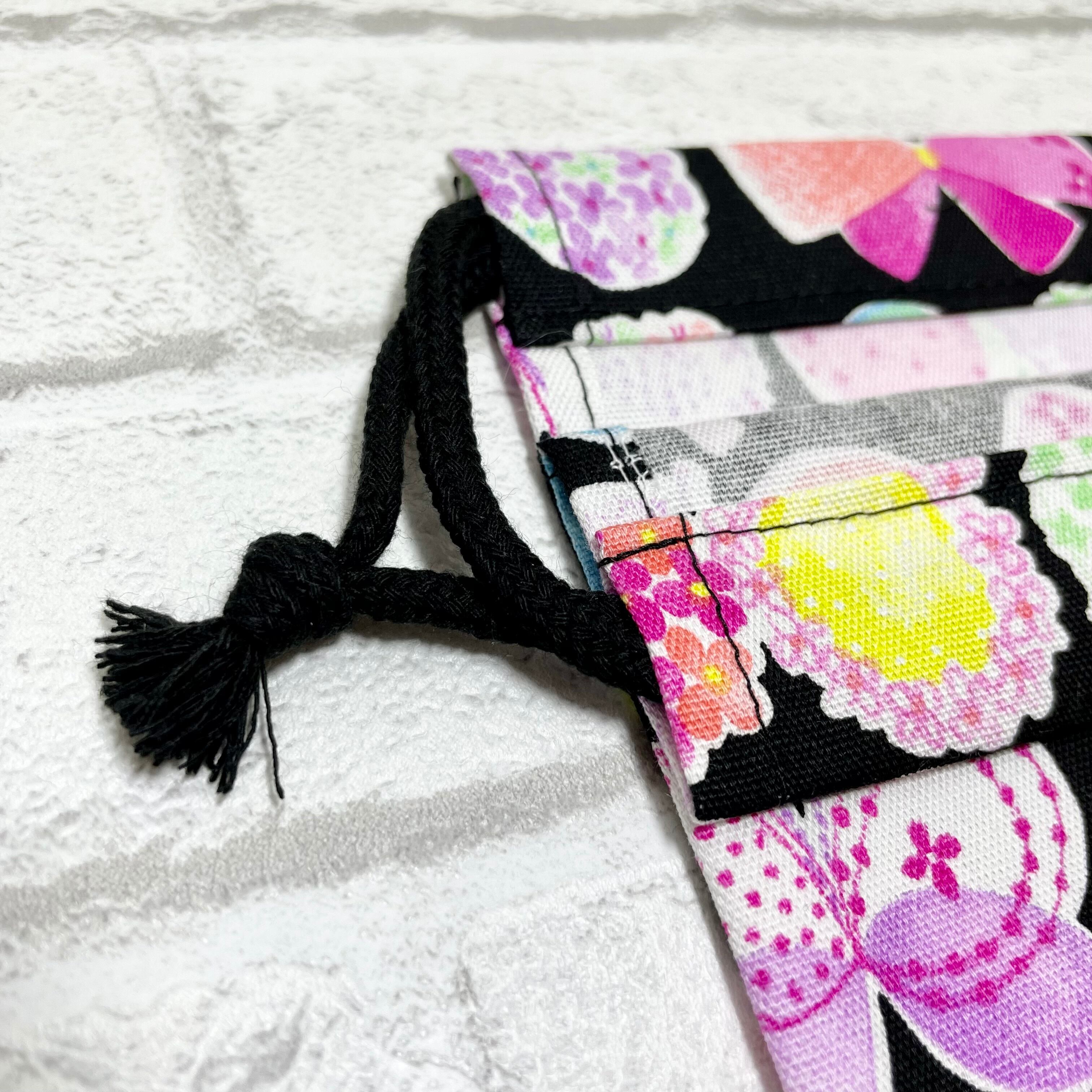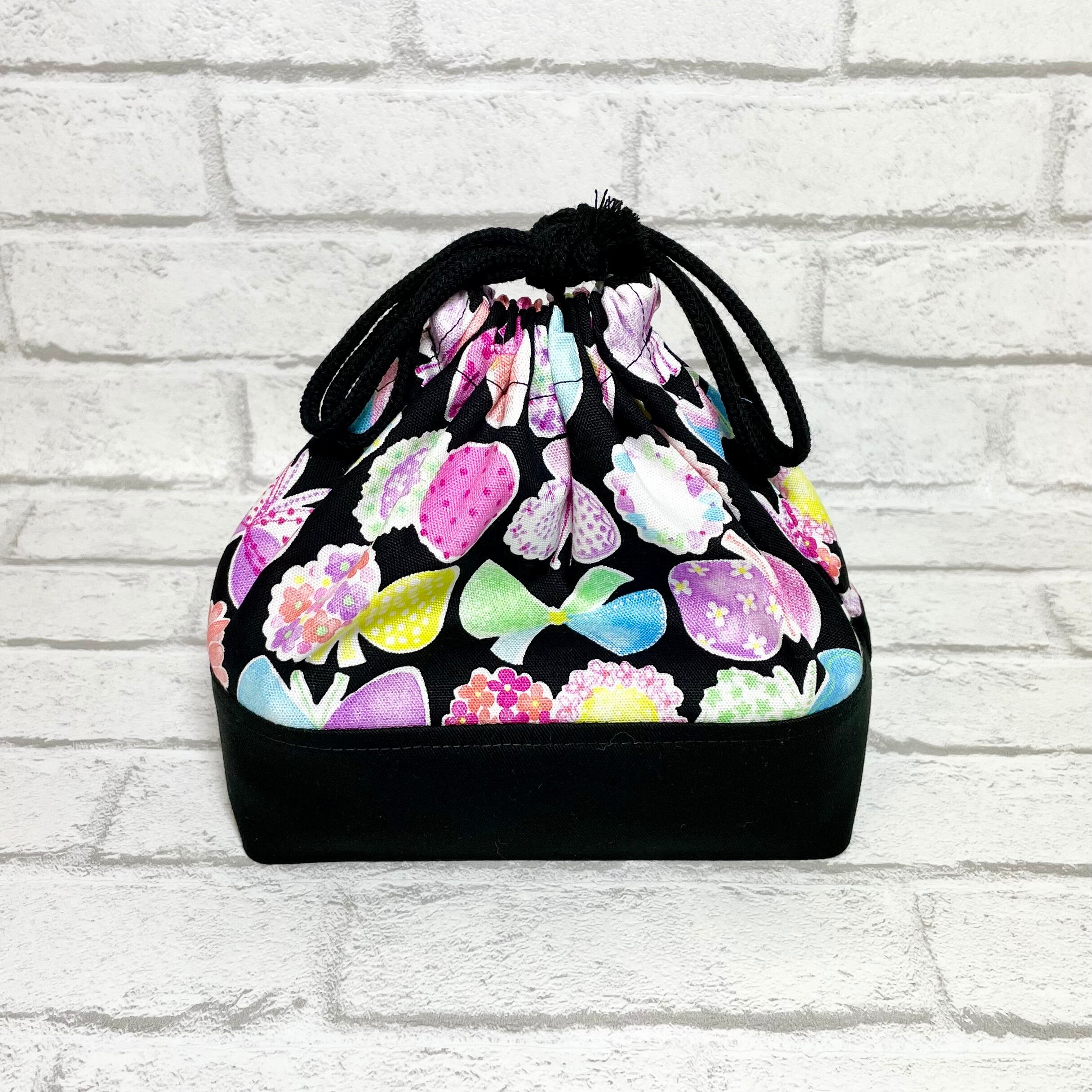 ブラックにカラフルなアクセントが加わった、目を引くデザインが特徴のお弁当袋です。