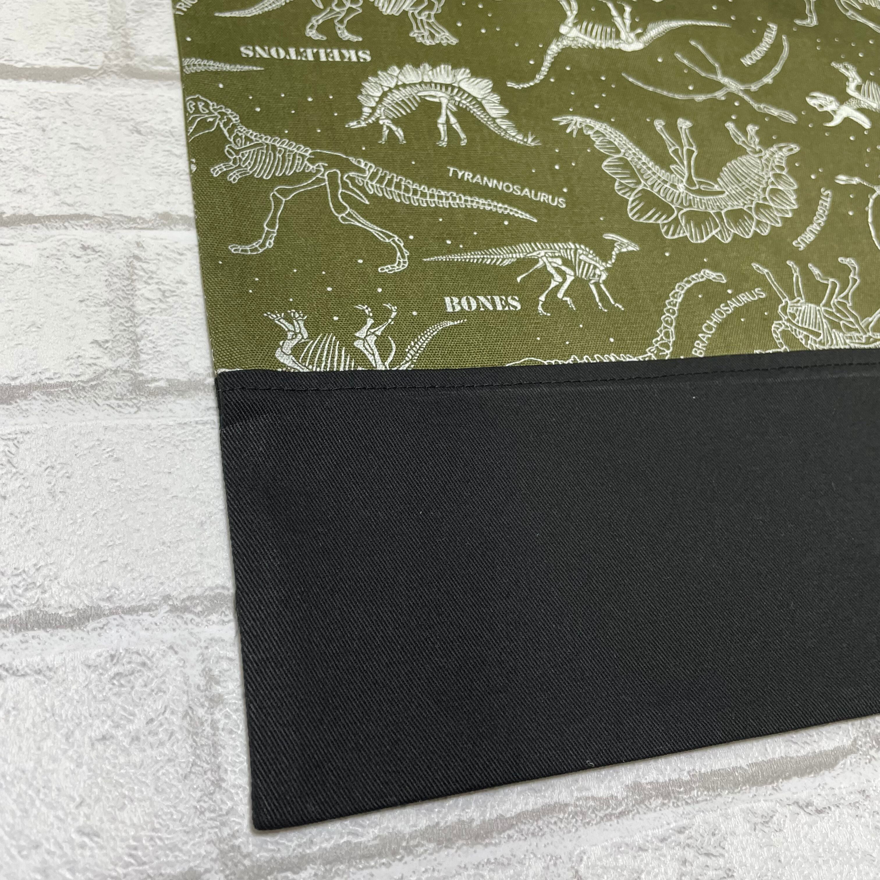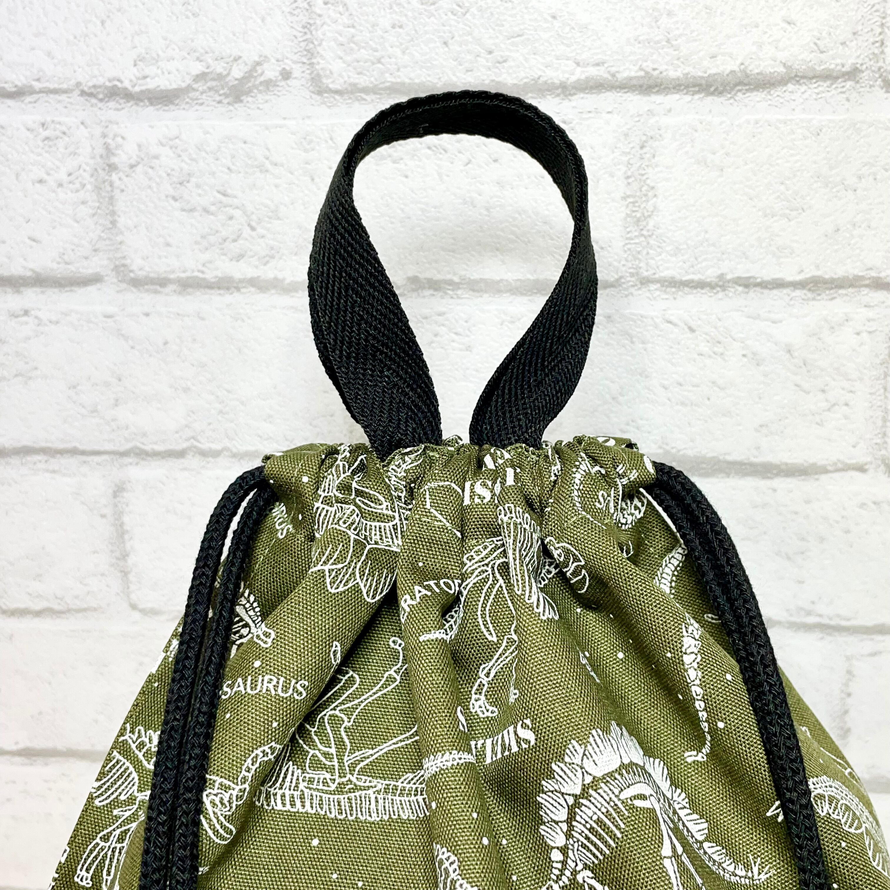 カーキを基調にした化石柄に黒のアクセントが施された、目を引く体操着袋です。