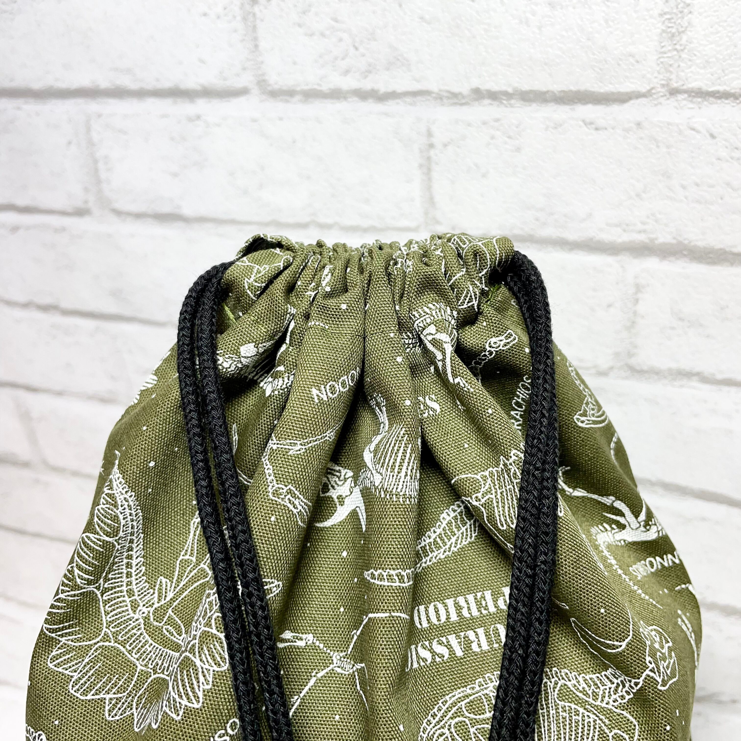 カーキを基調にした化石柄に黒のアクセントが施された、魅力的で目を引く体操着袋です。