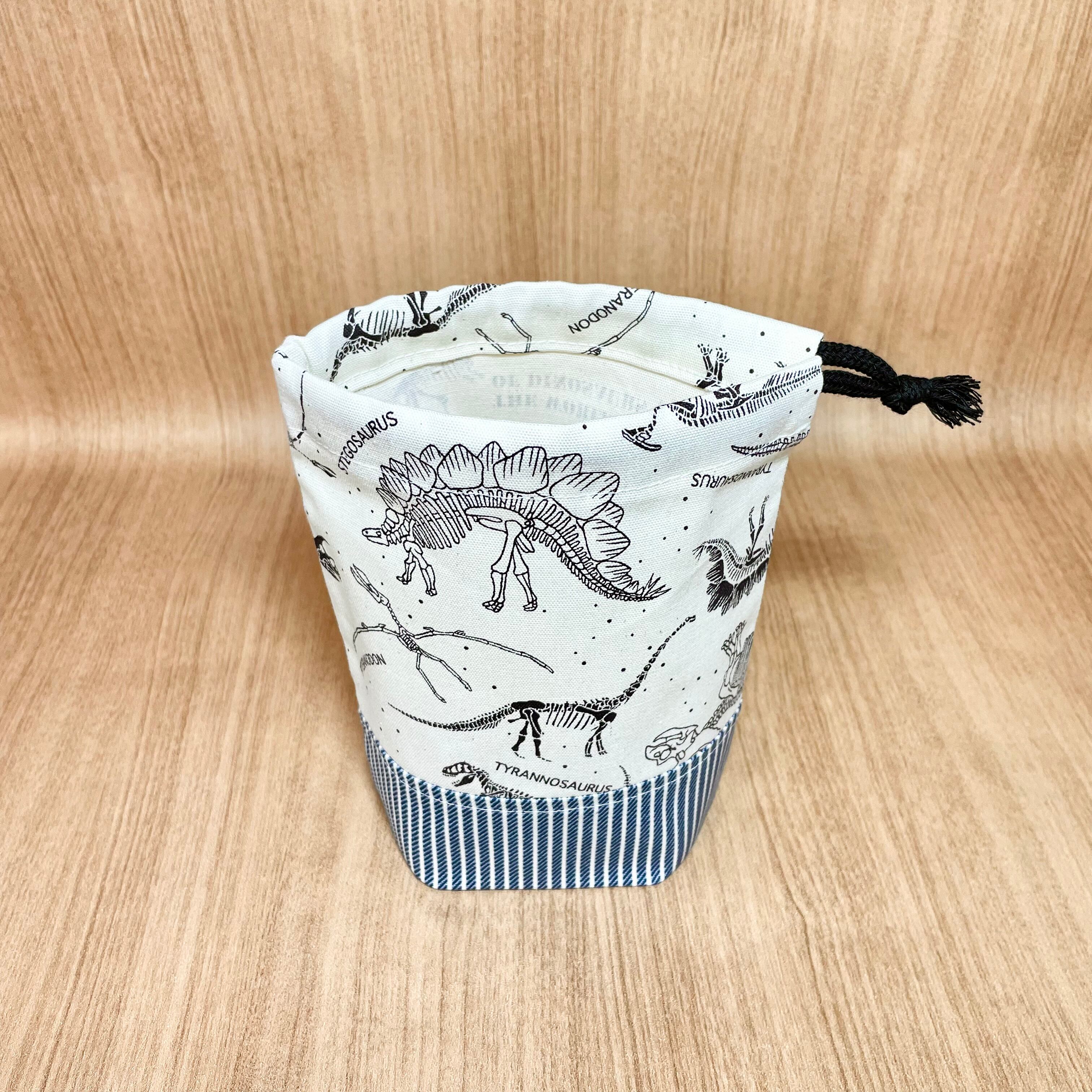 ナチュラルを基調にした化石柄とストライプが施された、目を引くコップ袋です。