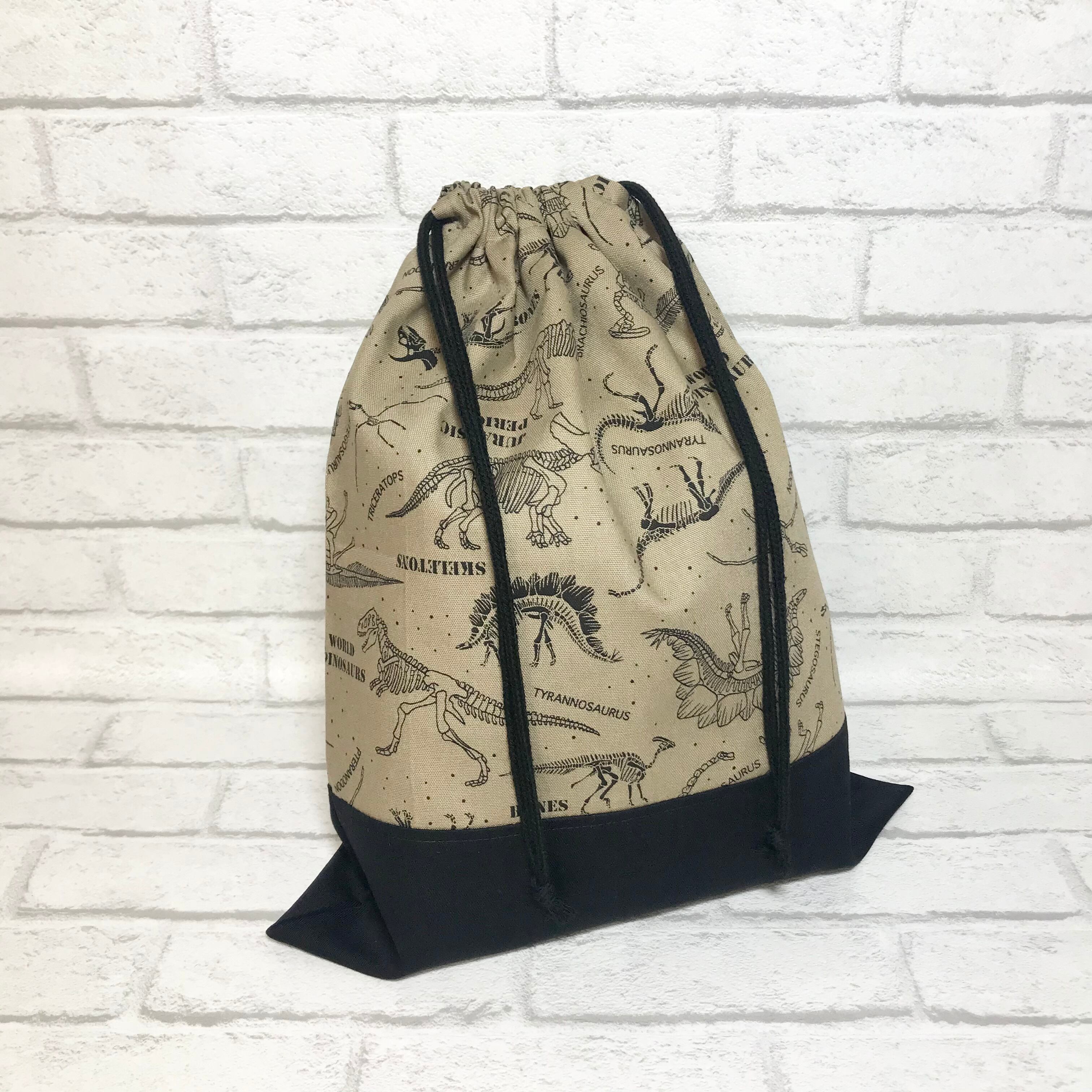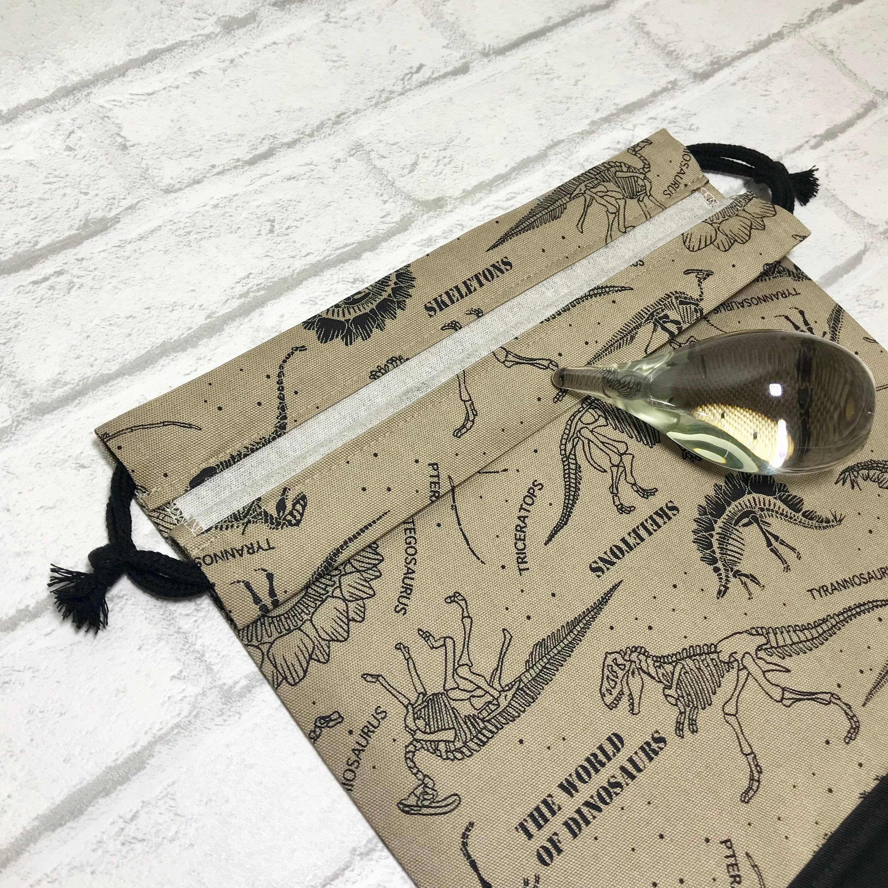 ベージュを基調にした化石柄に黒があしらわれた、目を引く体操着袋です。