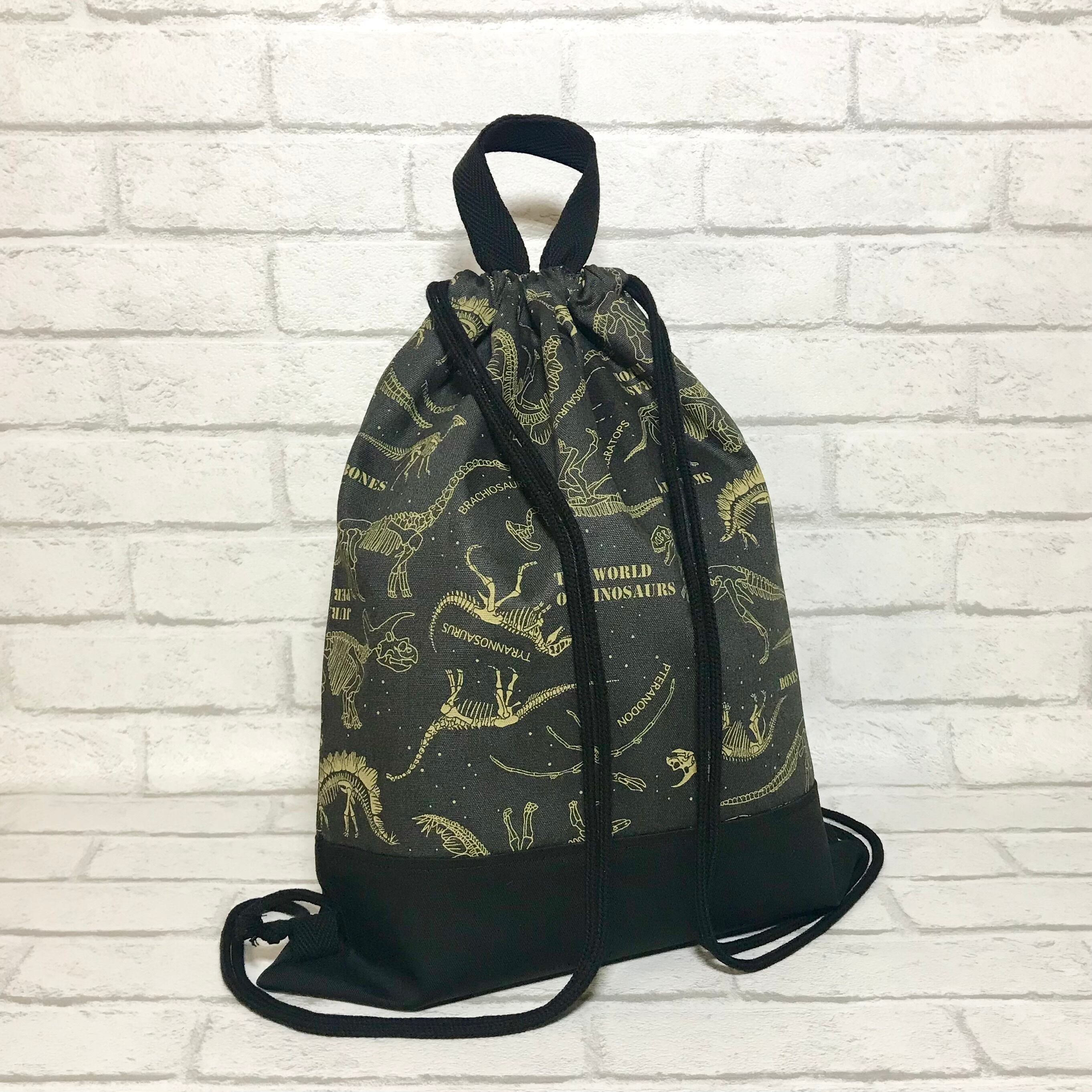 ダークカーキを基調にした化石柄と黒の組み合わせが施された、目を引くナップサックです。
