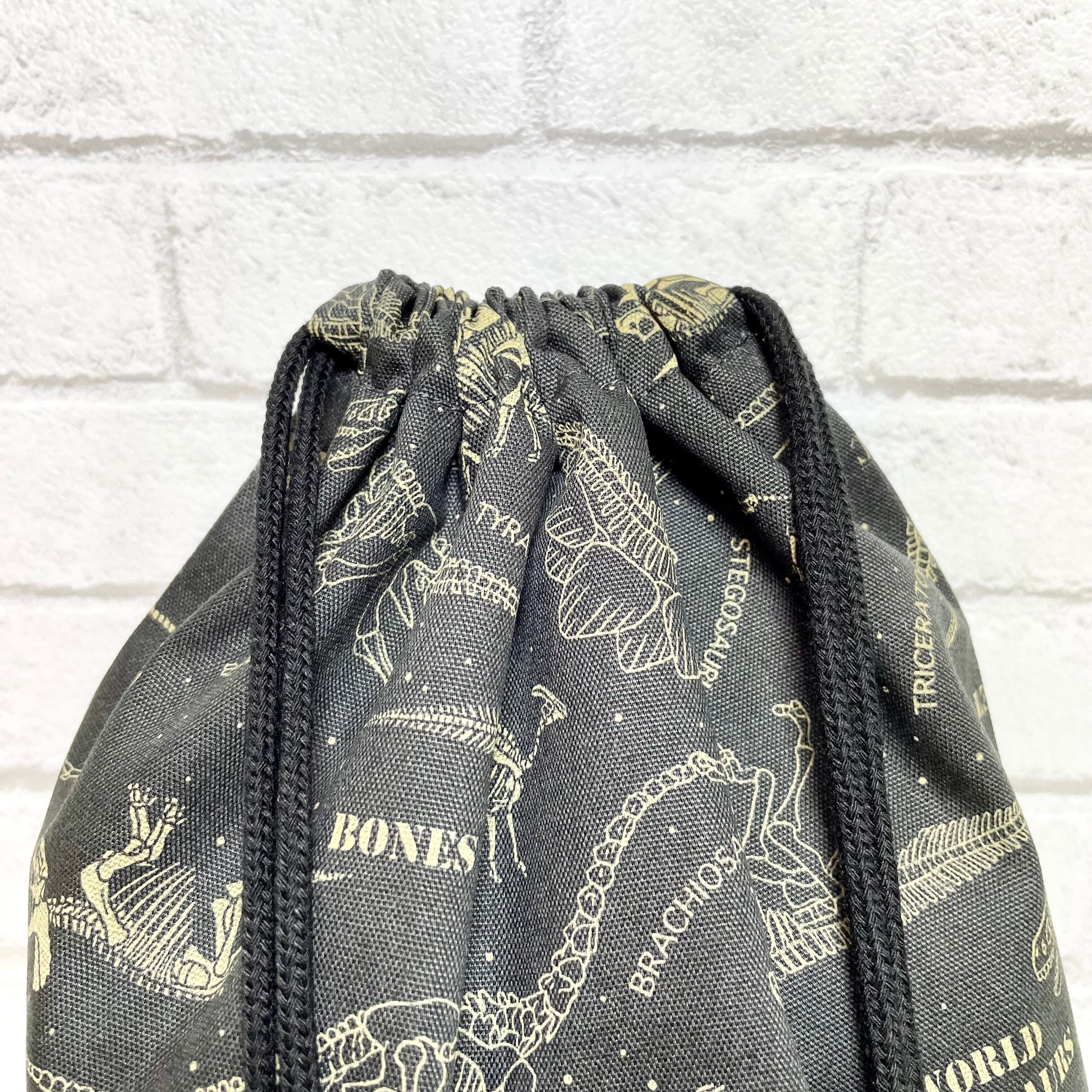 ダークカーキを基調にした化石柄と黒の組み合わせが施された、目を引く体操着袋です。