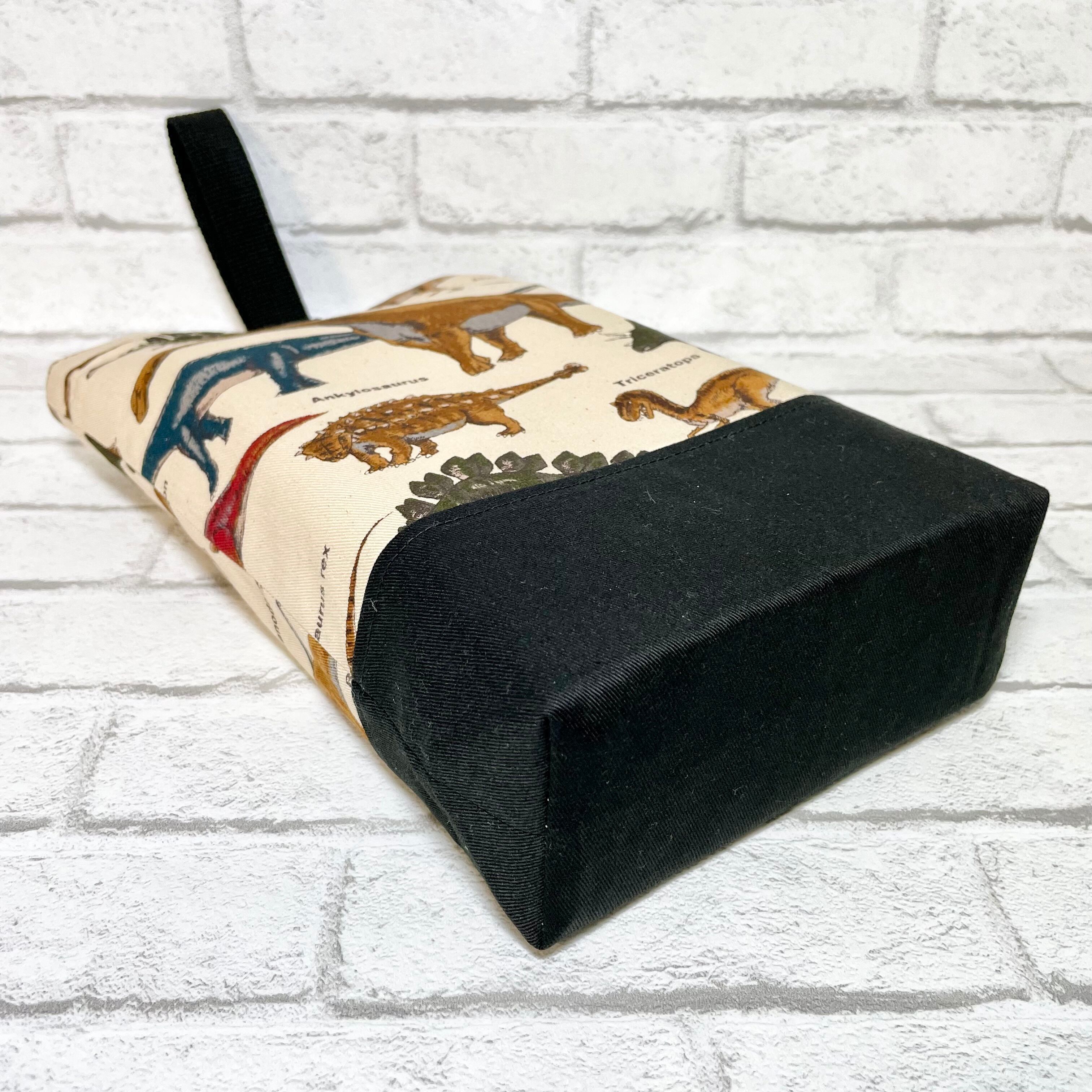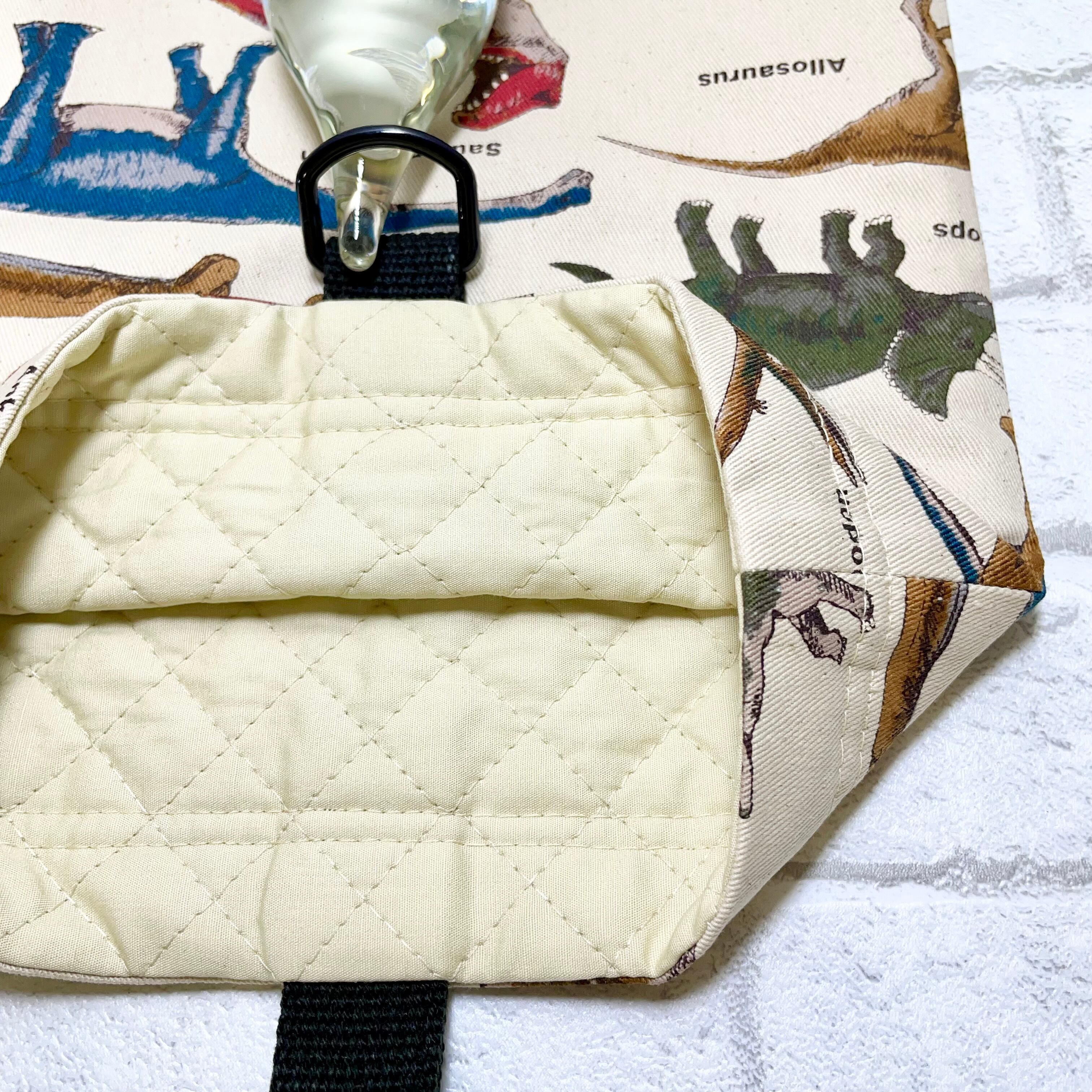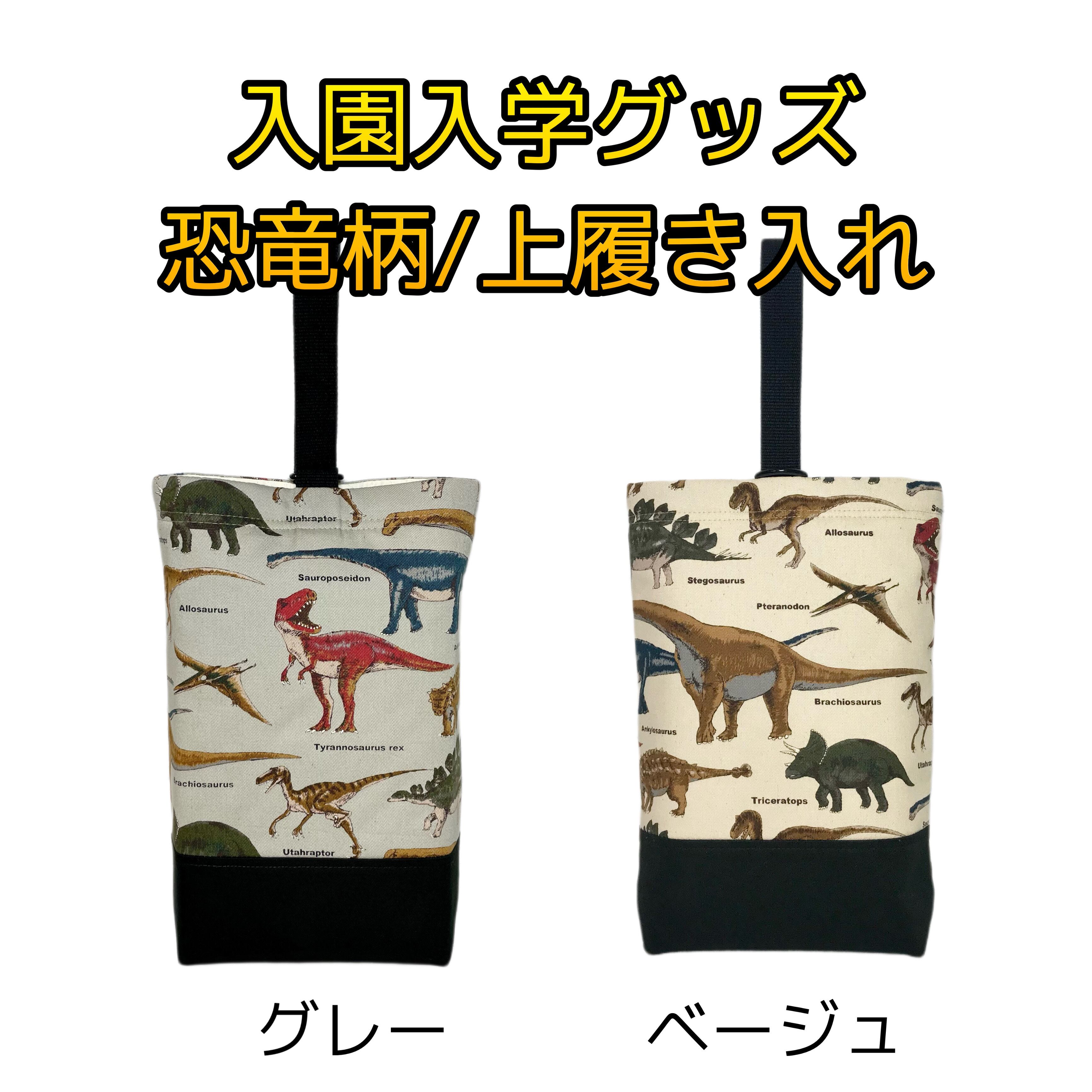 ベージュを基調にした恐竜柄と黒の組み合わせが施された、目を引く上履き入れです。