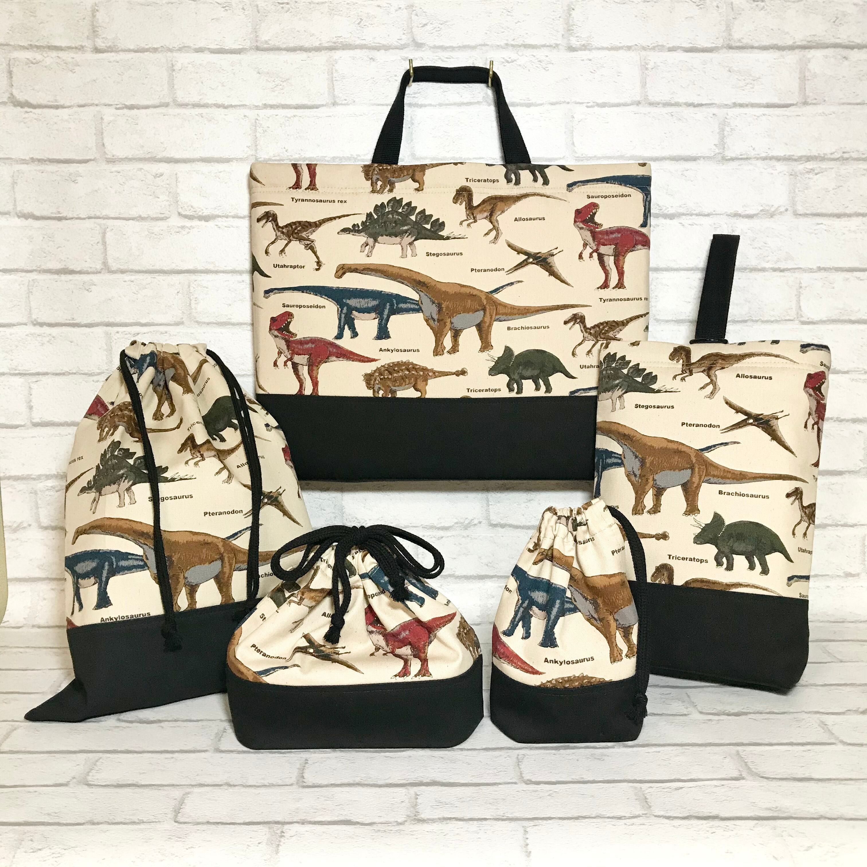 ベージュを基調にした恐竜柄と黒の組み合わせが施された、目を引くナップサックです。