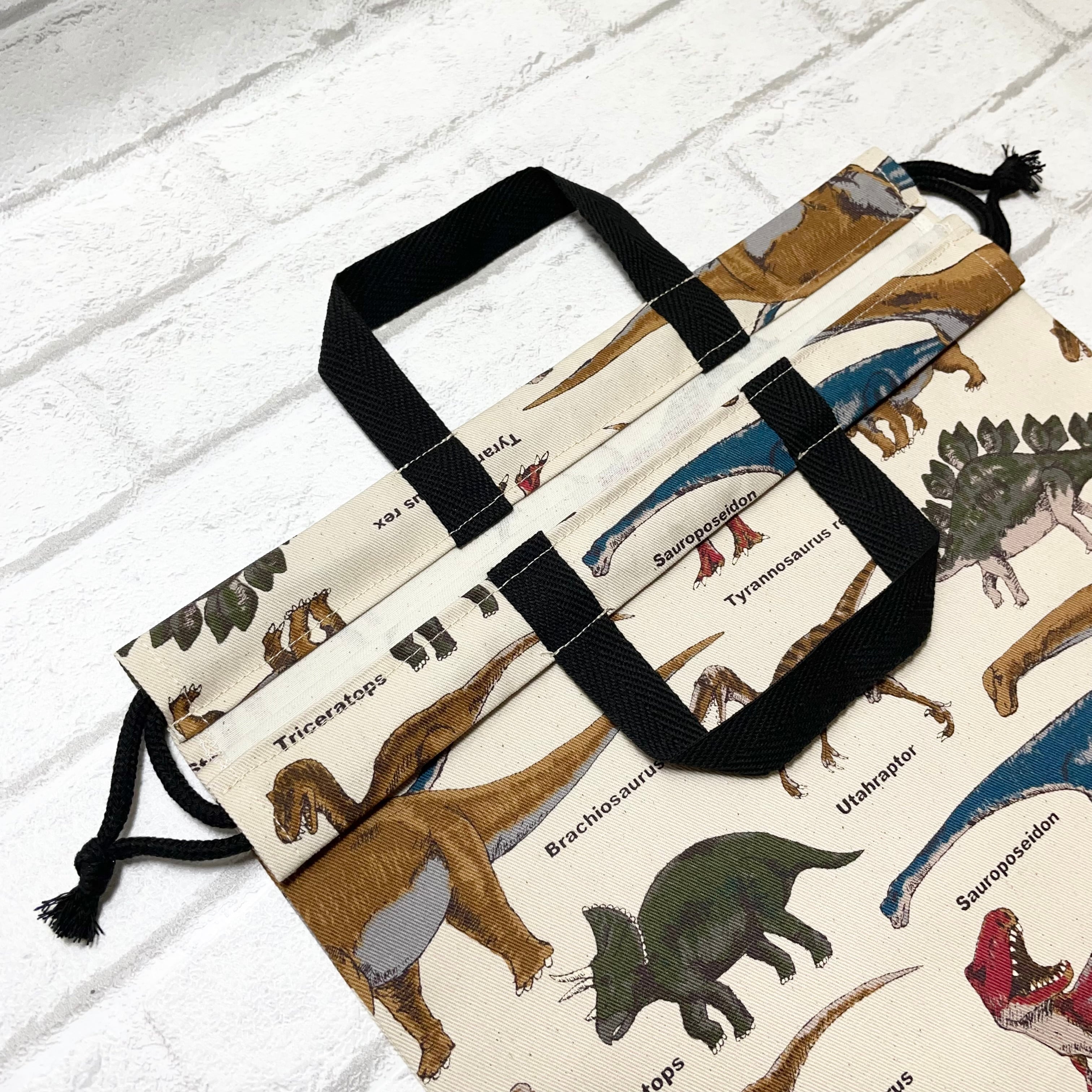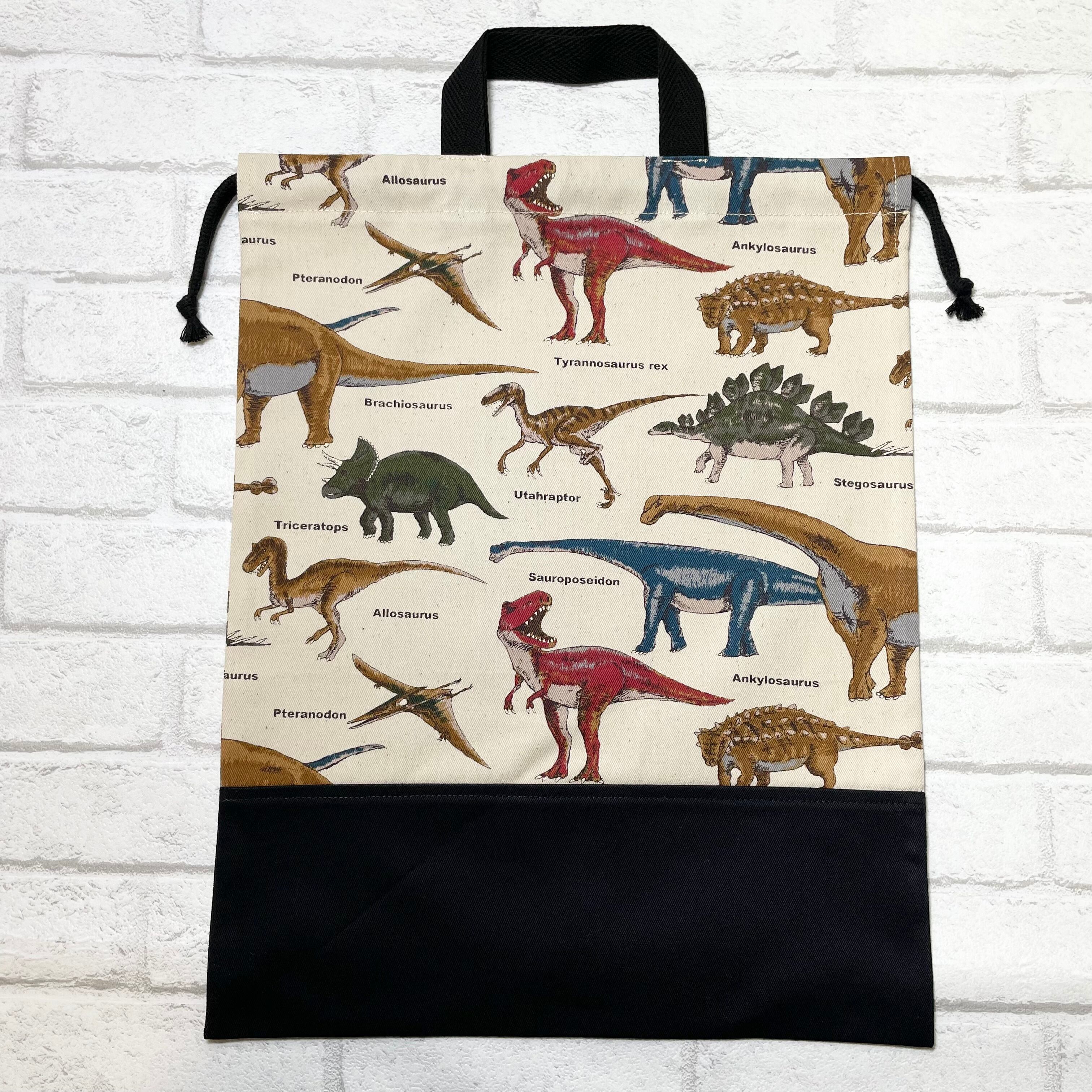 ベージュを基調にした恐竜柄と黒の組み合わせが施された、目を引く体操着袋です。