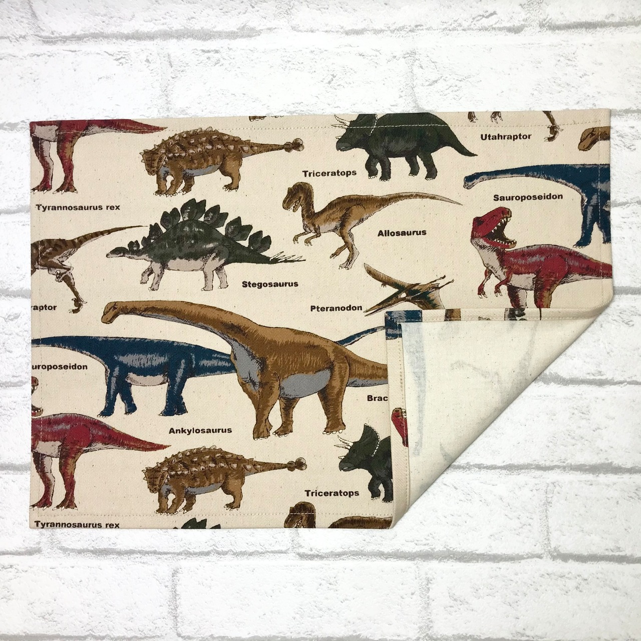 ベージュを基調にした恐竜柄が施された、目を引くランチョンマットです。