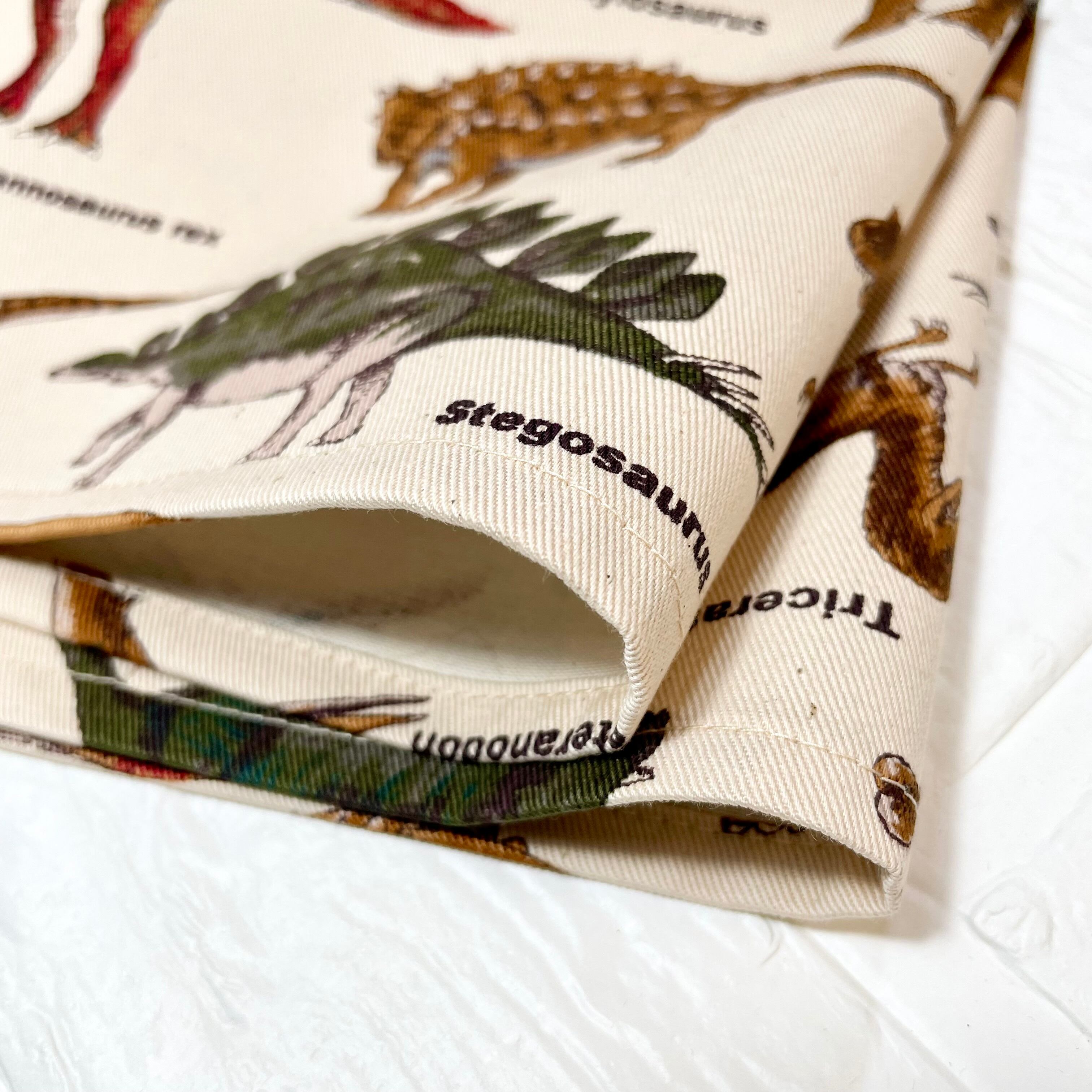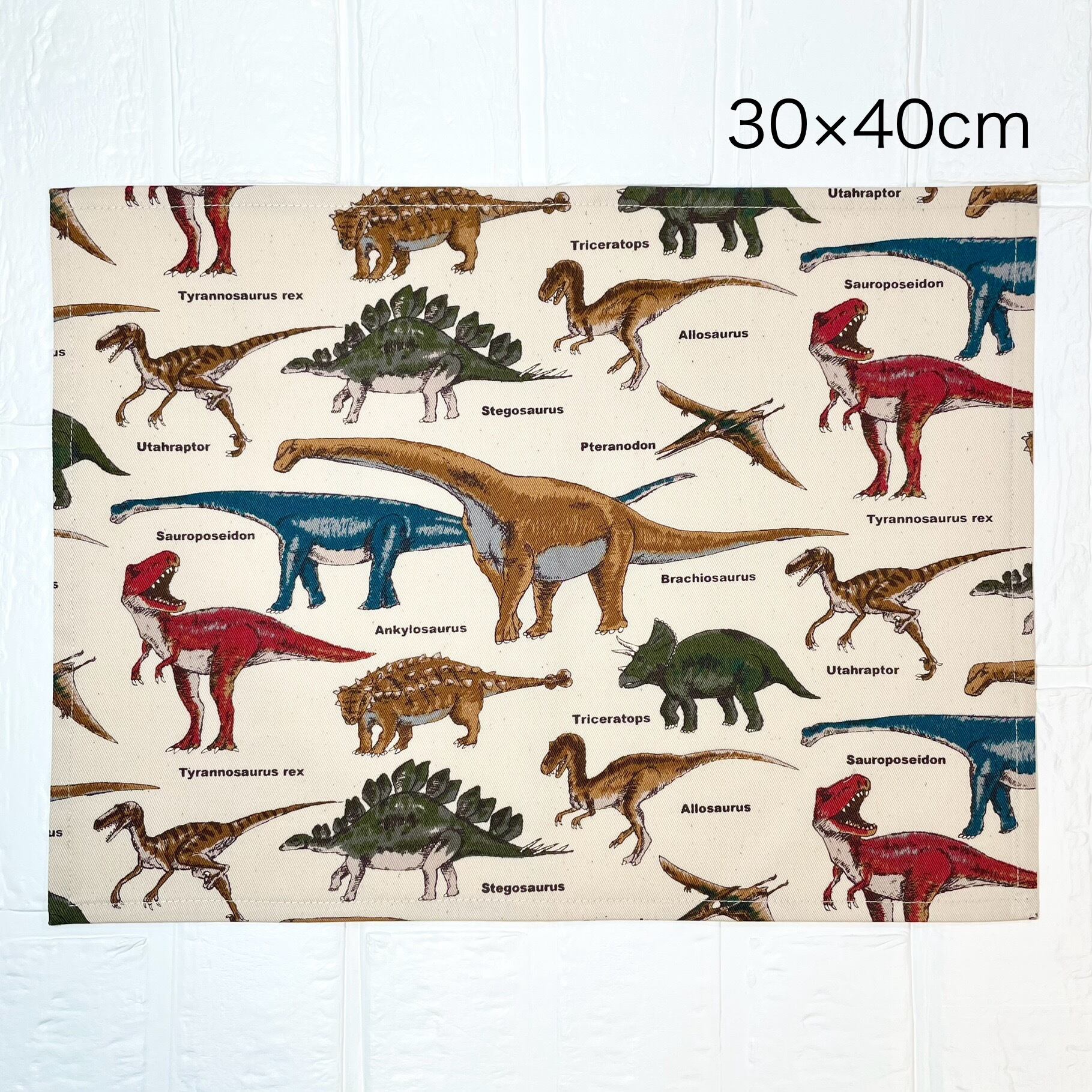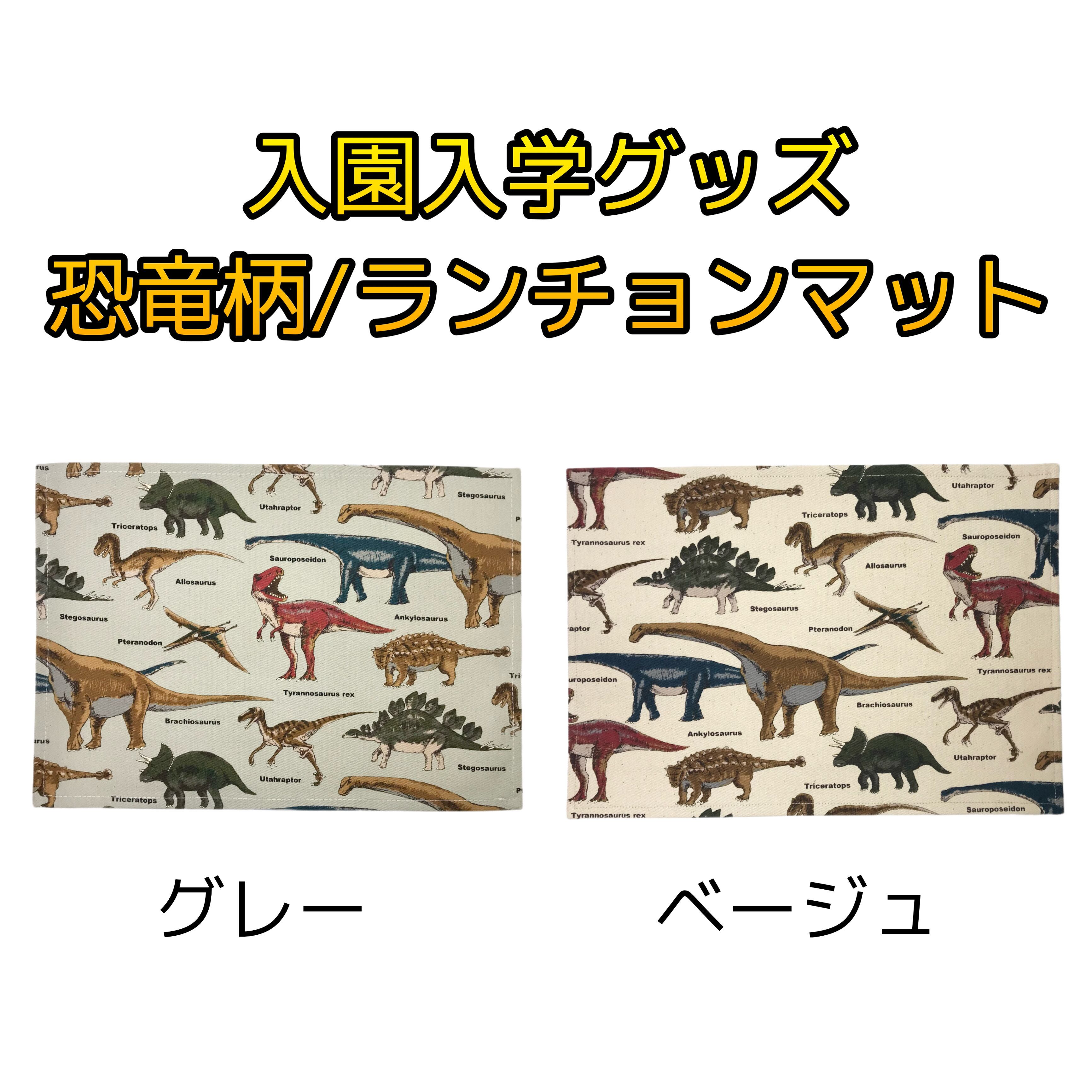 ベージュを基調にした恐竜柄が施された、目を引くランチョンマットです。