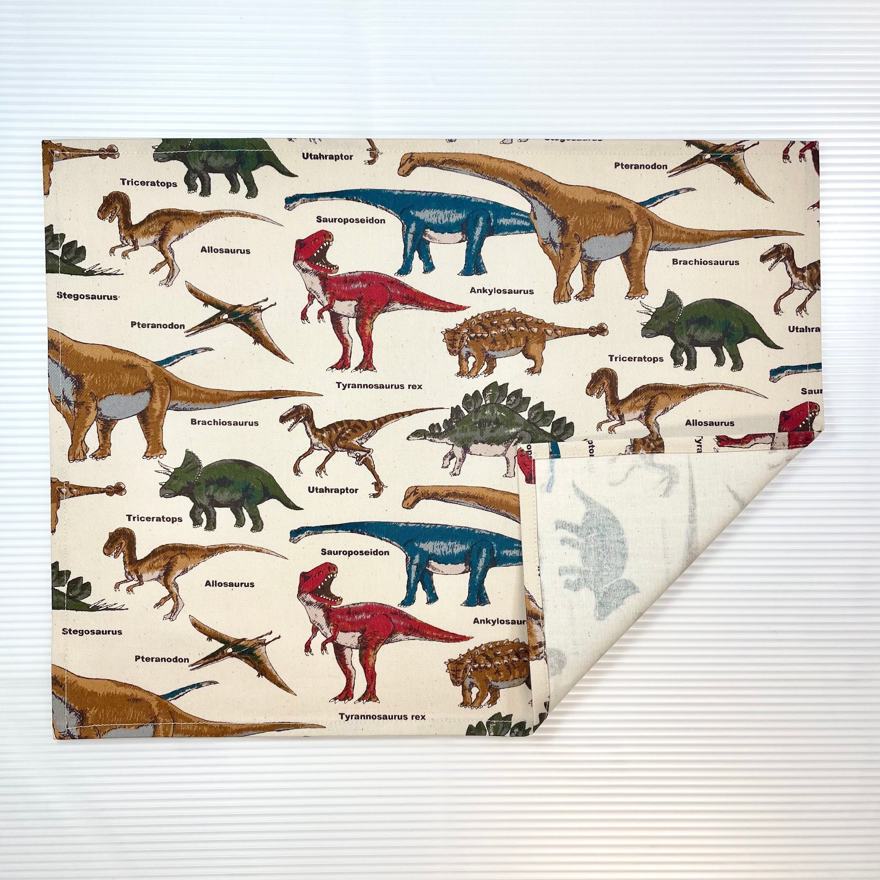 ベージュを基調にした恐竜柄が施された、目を引くランチョンマットです。