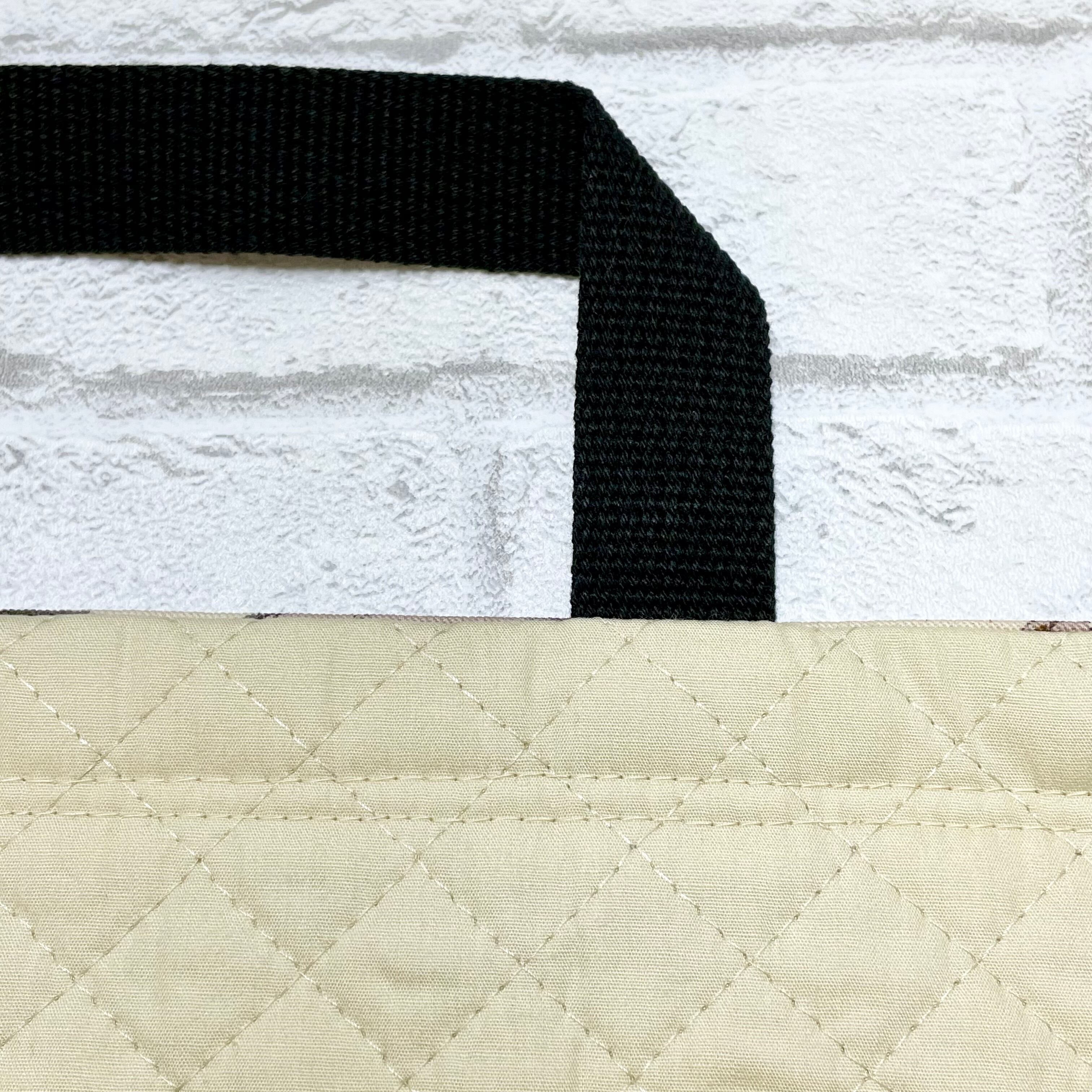 グレーを基調にした恐竜柄と黒のコントラストが目を引くレッスンバッグです。