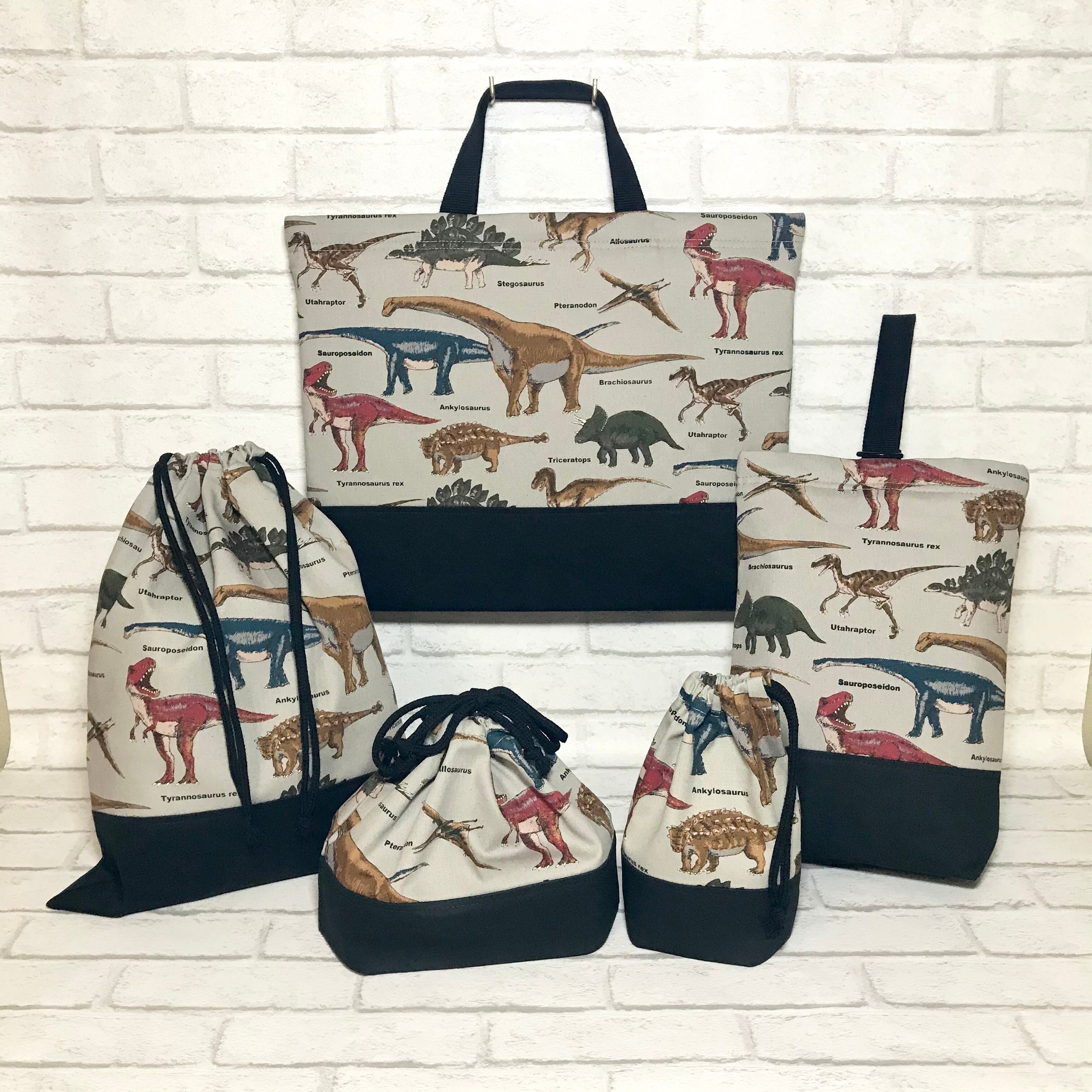 グレーを基調にした恐竜柄と黒のコントラストが目を引くお道具袋です。