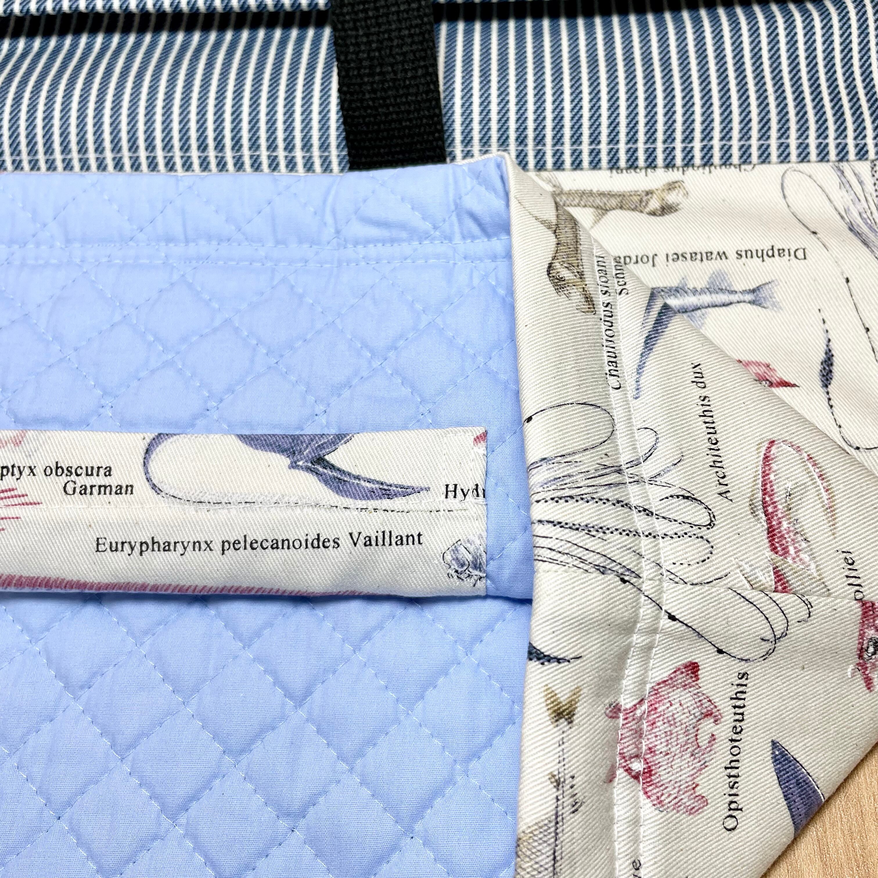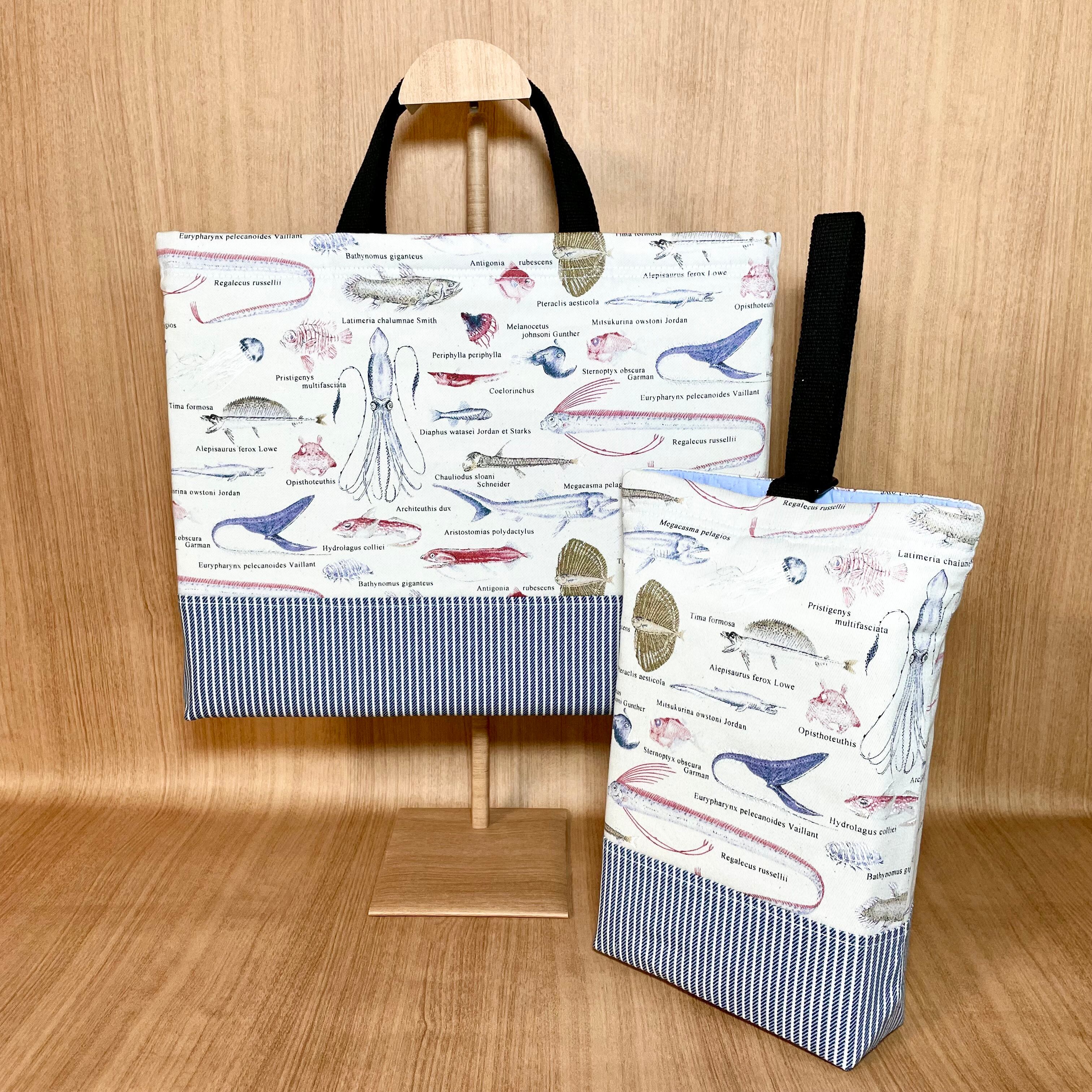 生成りを基調にした深海魚のデザインとストライプが特徴的なレッスンバッグです。