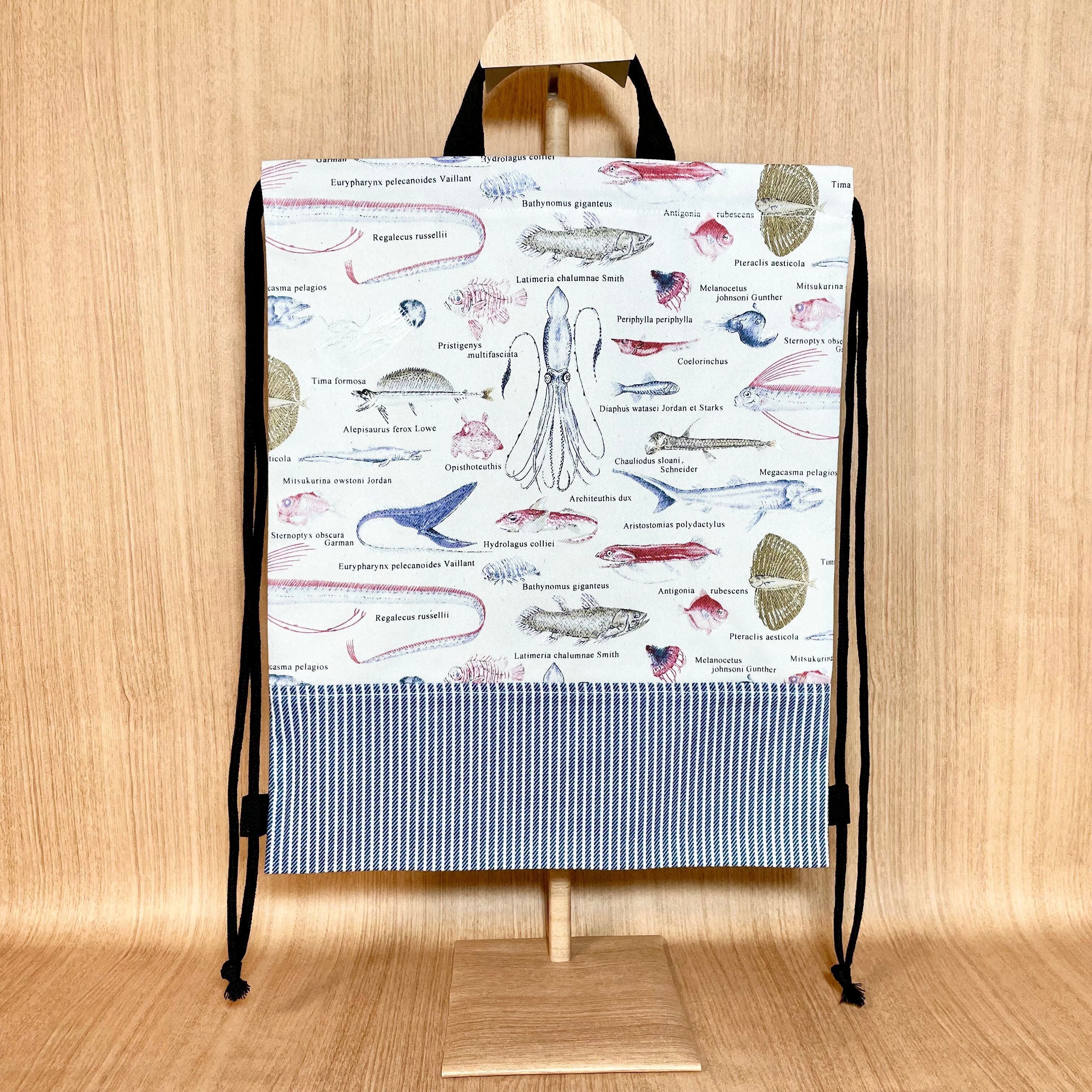 生成りを基調にした深海魚とストライプが特徴的なナップサックです。