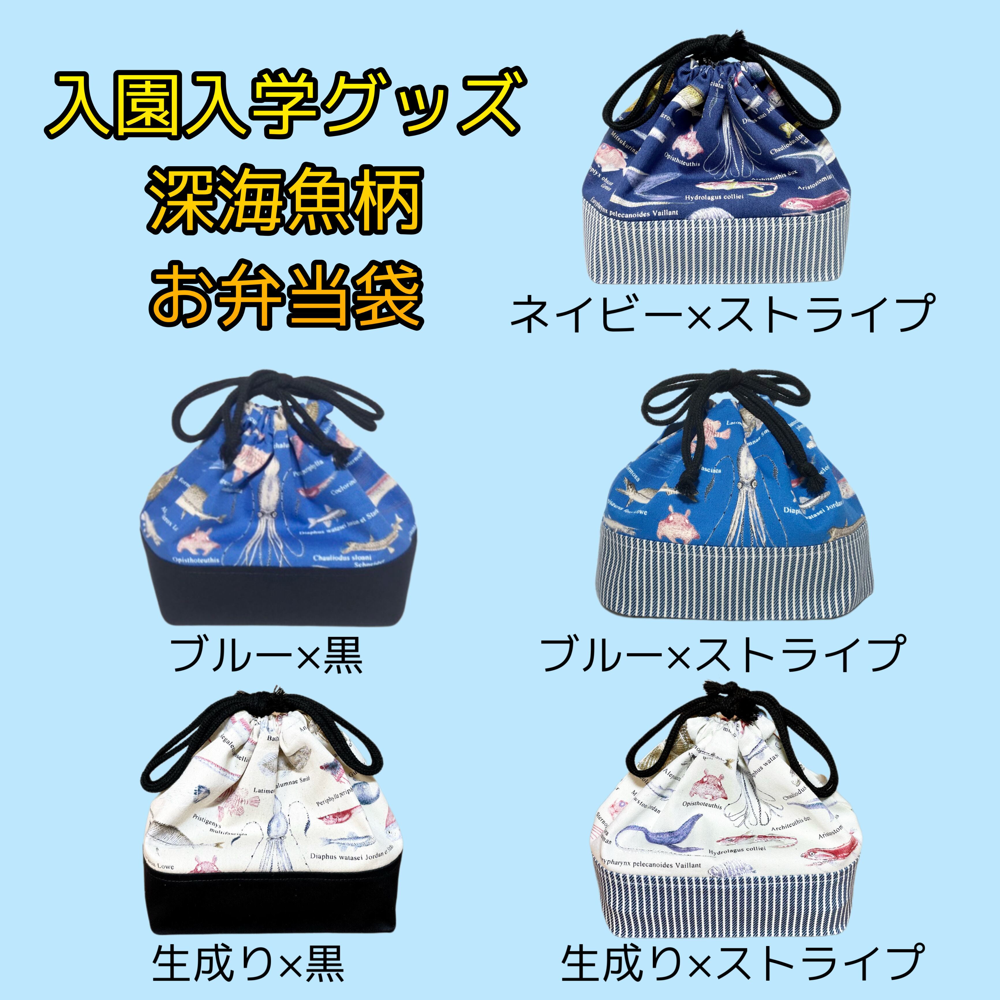 大人気の深海魚(生成り)×ストライプ お弁当袋が新登場です!シンプルでありながらも個性的なデザインが、あなたの日常のランチタイムを特別に演出します。高品質な素材を使用し、軽量で持ち運びやすい仕様となっています。実用的な設計で、学校やピクニックなどのお弁当を持ち運ぶシーンで大活躍するアイテムをぜひお楽しみください!