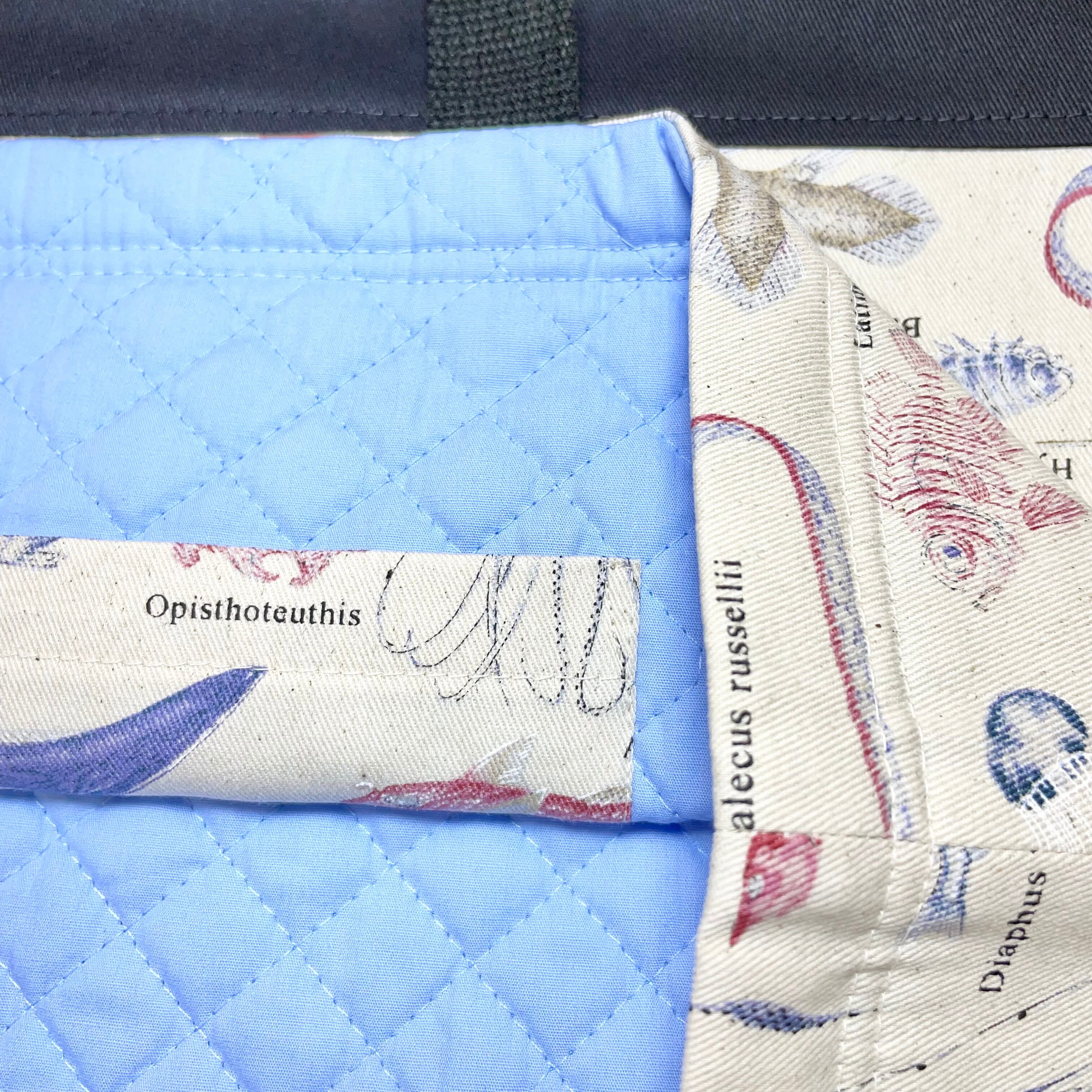 生成りを基調にした深海魚のデザインに、スタイリッシュな黒が際立つレッスンバッグです。