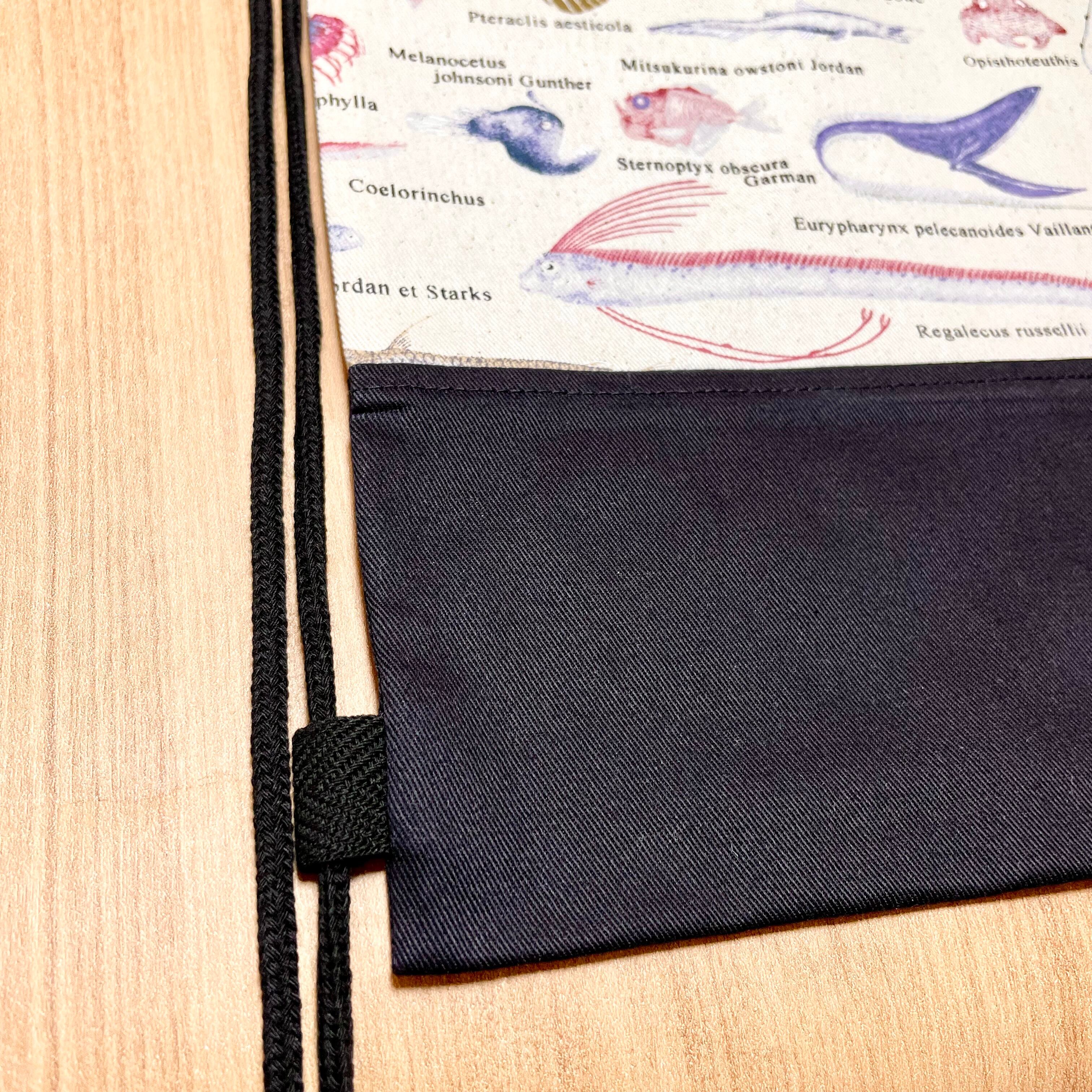 生成りを基調にした深海魚のデザインに、スタイリッシュな黒が際立つナップサックです。