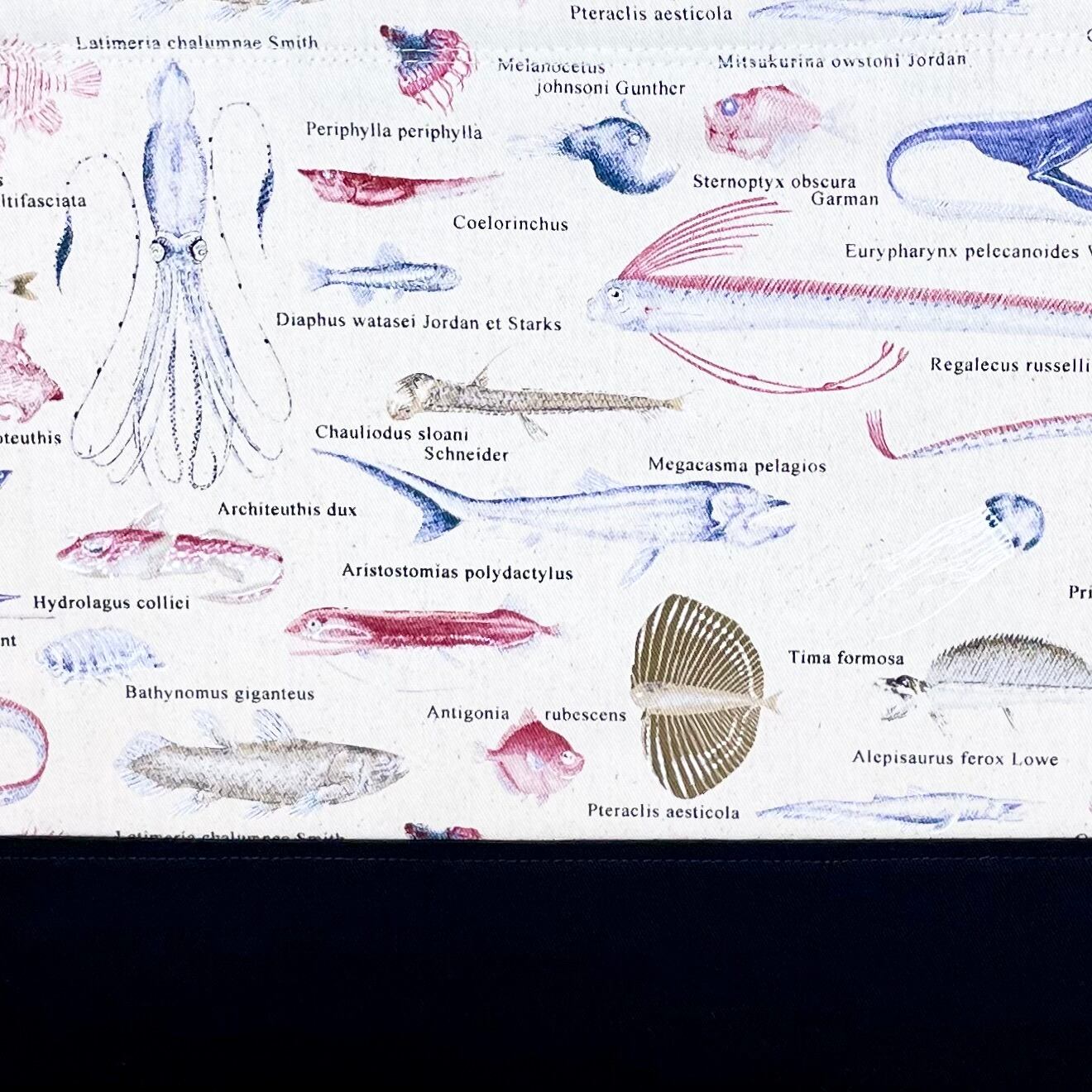 生成りを基調にした深海魚のデザインに、スタイリッシュな黒が映える体操着袋です。