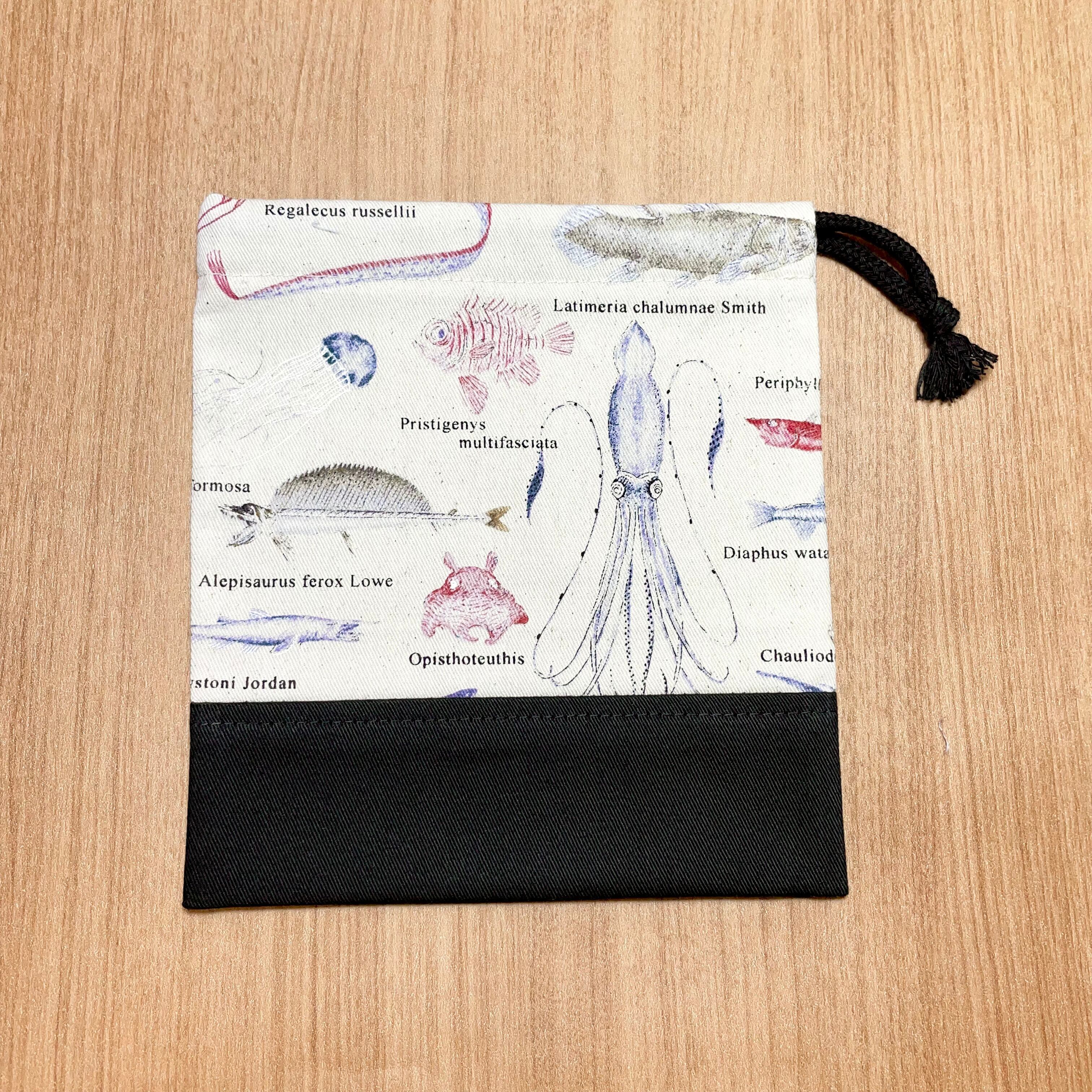 生成りを基調にした深海魚のデザインに、スタイリッシュな黒が映えるコップ袋です。