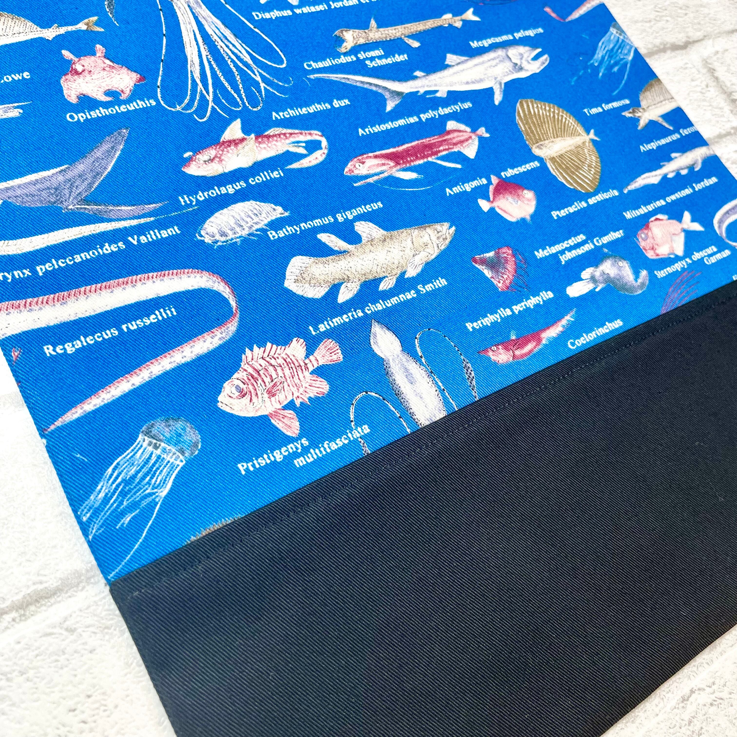 ブルーを基調にした深海魚のデザインに、スタイリッシュな黒が映える持ち手付き体操着袋です。
