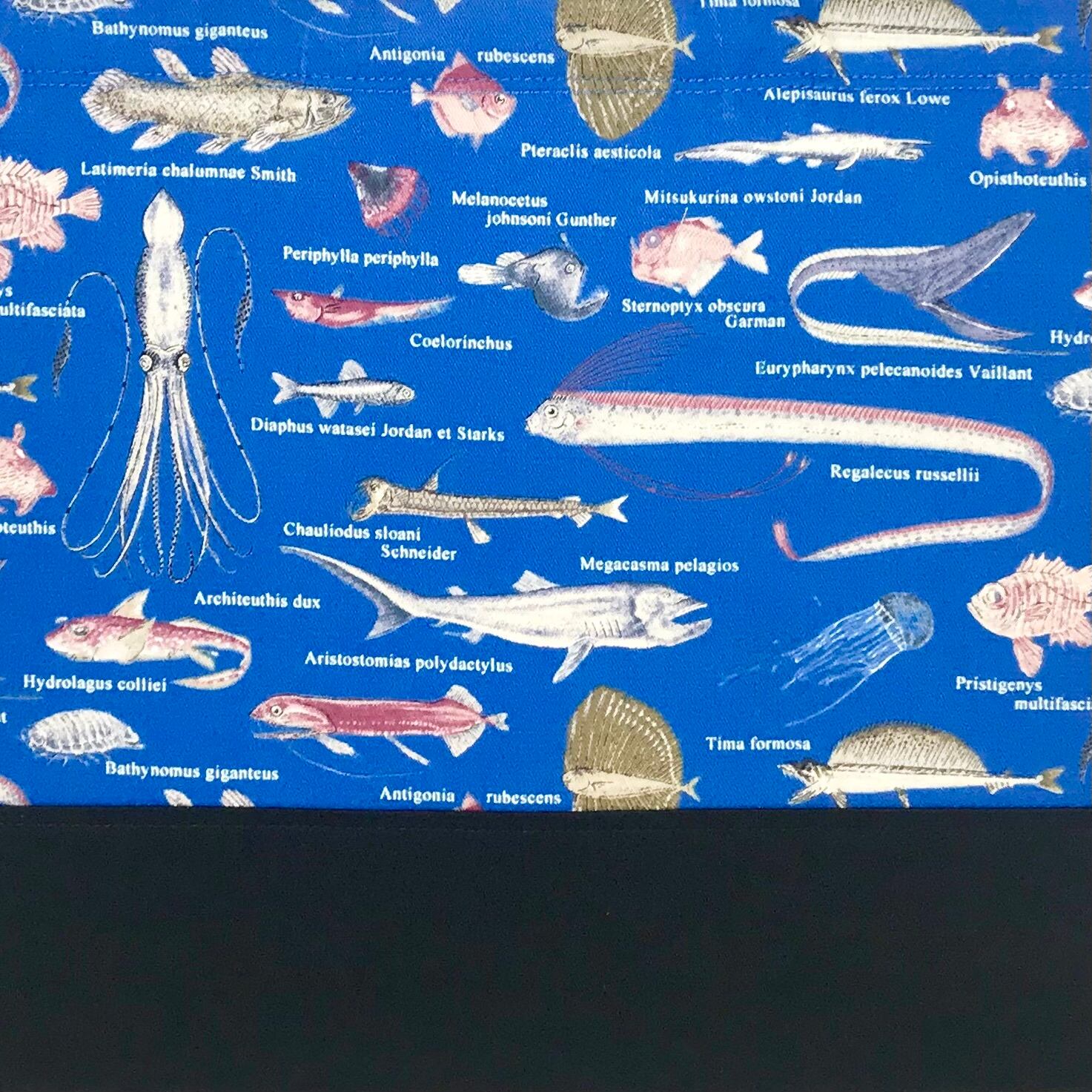 ブルーを基調にした深海魚のデザインに、スタイリッシュな黒が映えるコップ袋です。