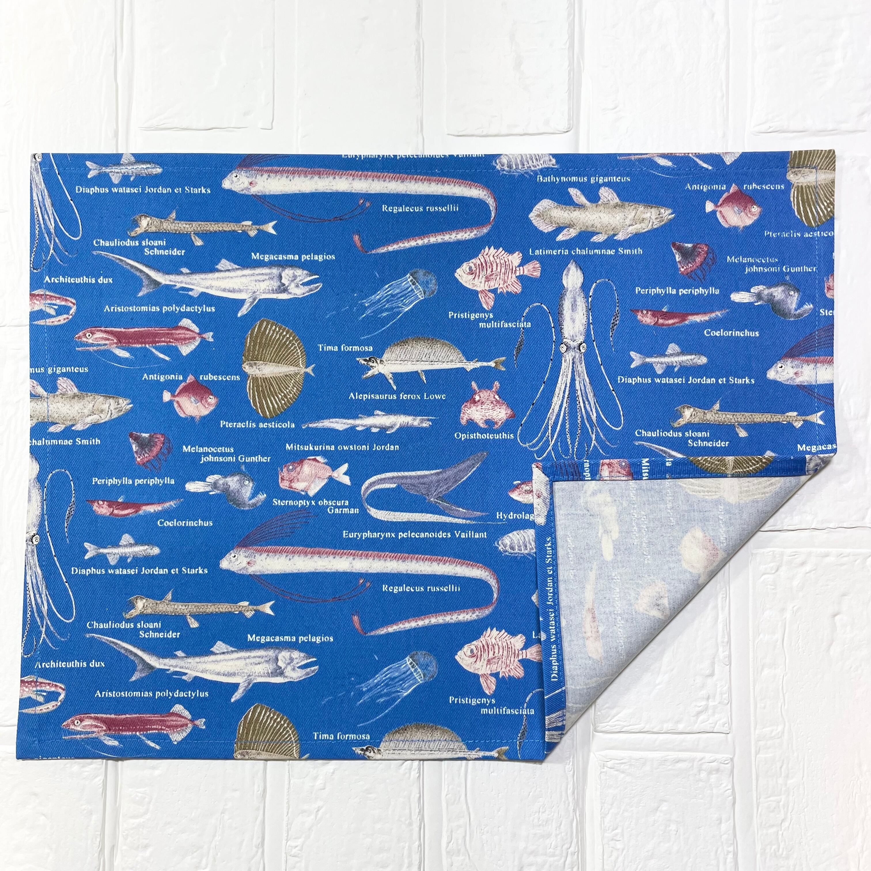 ブルーを基調にした深海魚のデザインが、食卓に海の神秘を与えるランチョンマットです。