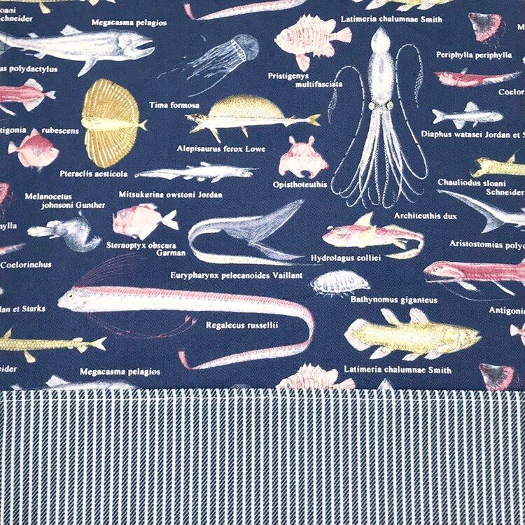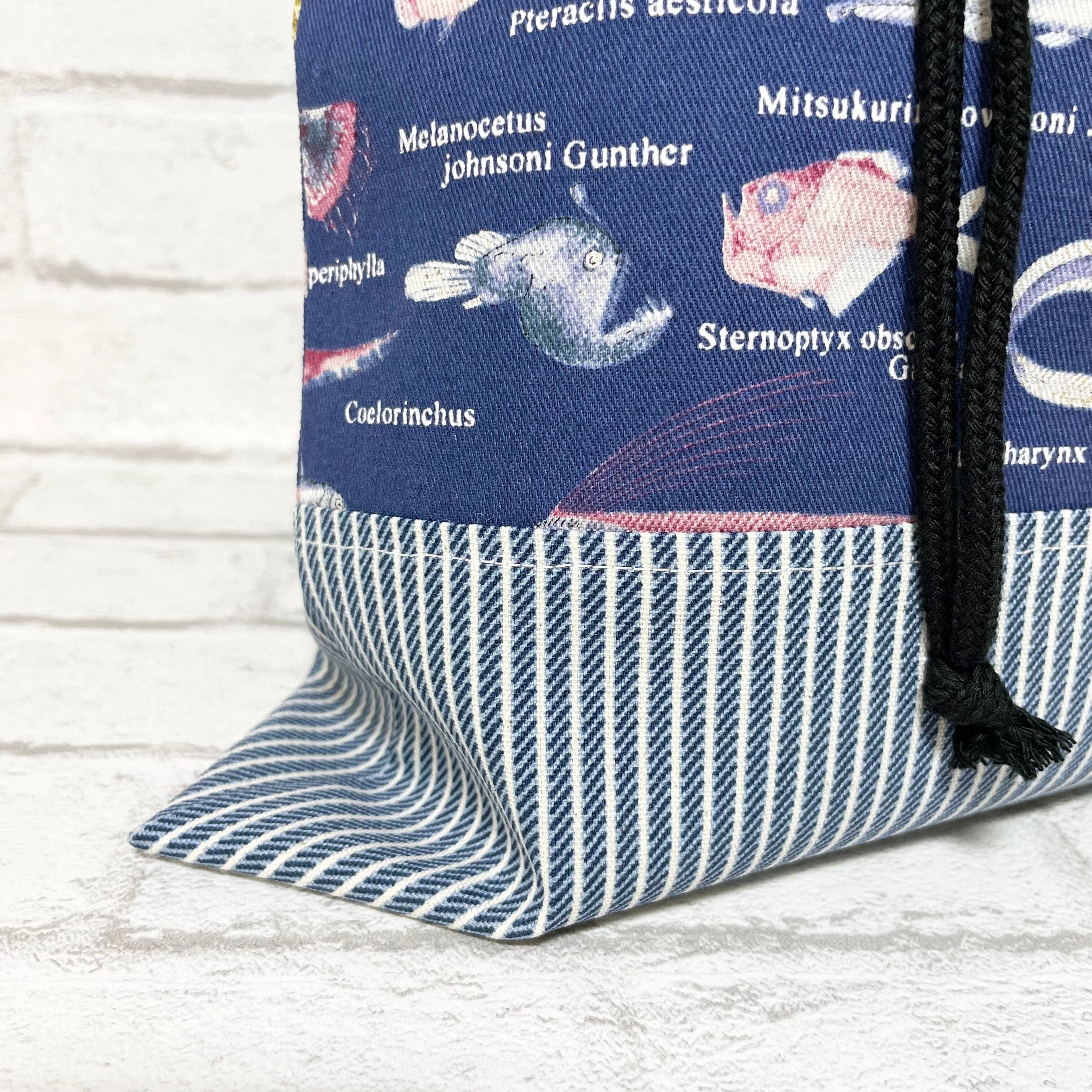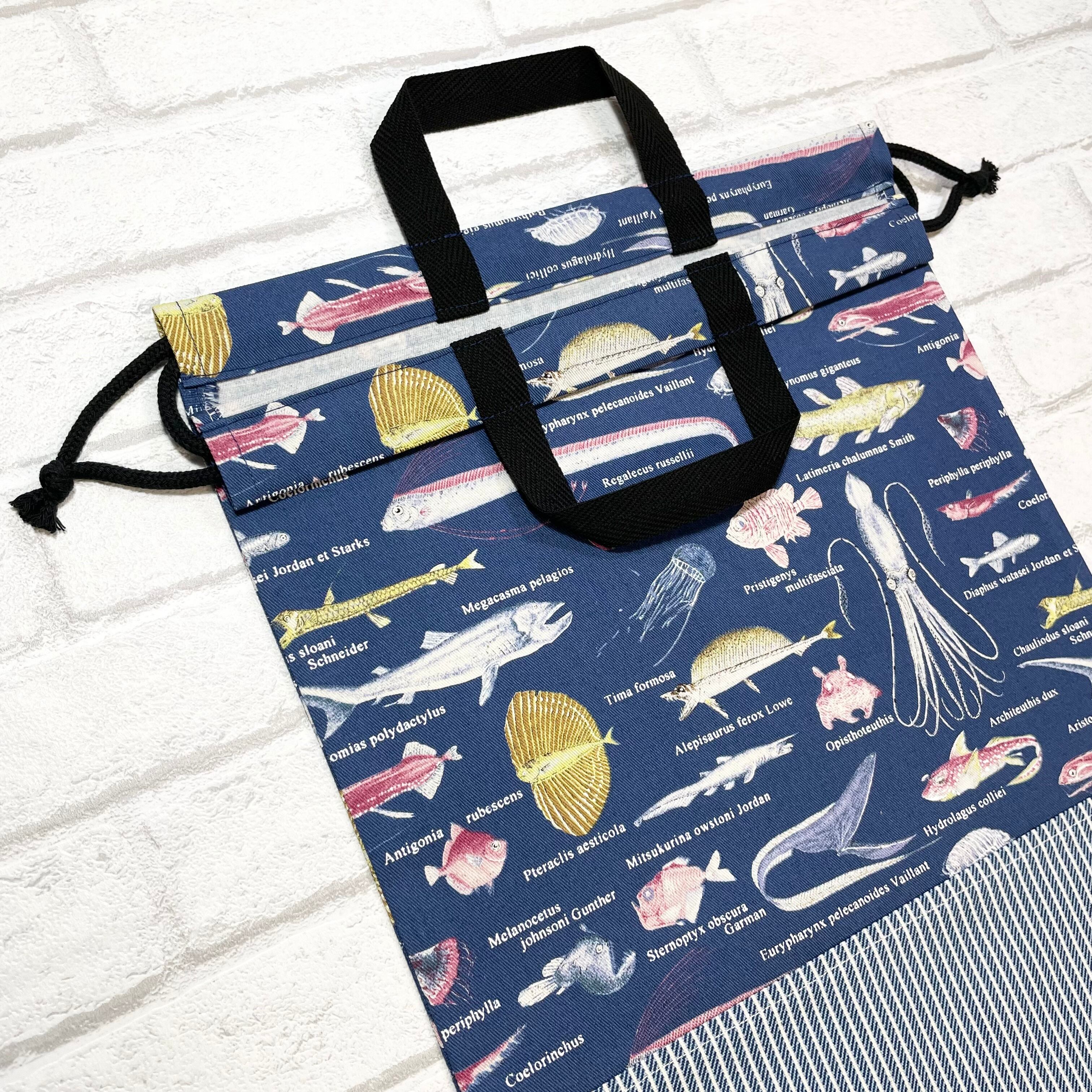 深海魚(ネイビー)×ストライプ 持ち手付き体操着袋38×30cm