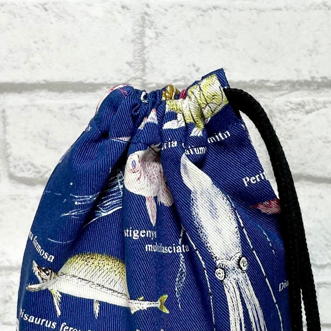 ネイビーを基調にした深海魚とストライプの組み合わせが、シンプルながらもスタイリッシュな印象を与えるコップ袋です。