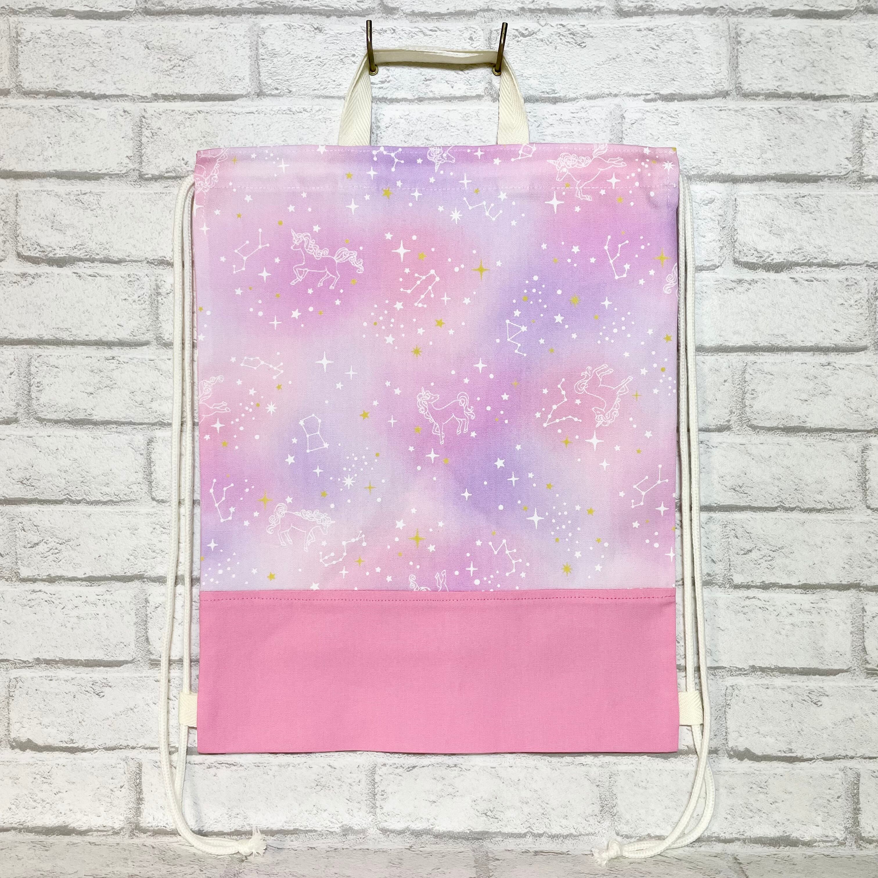 星座とユニコーンをモチーフにしたピンクのデザインが、夢の世界を感じさせる印象を与えるナップサックです。