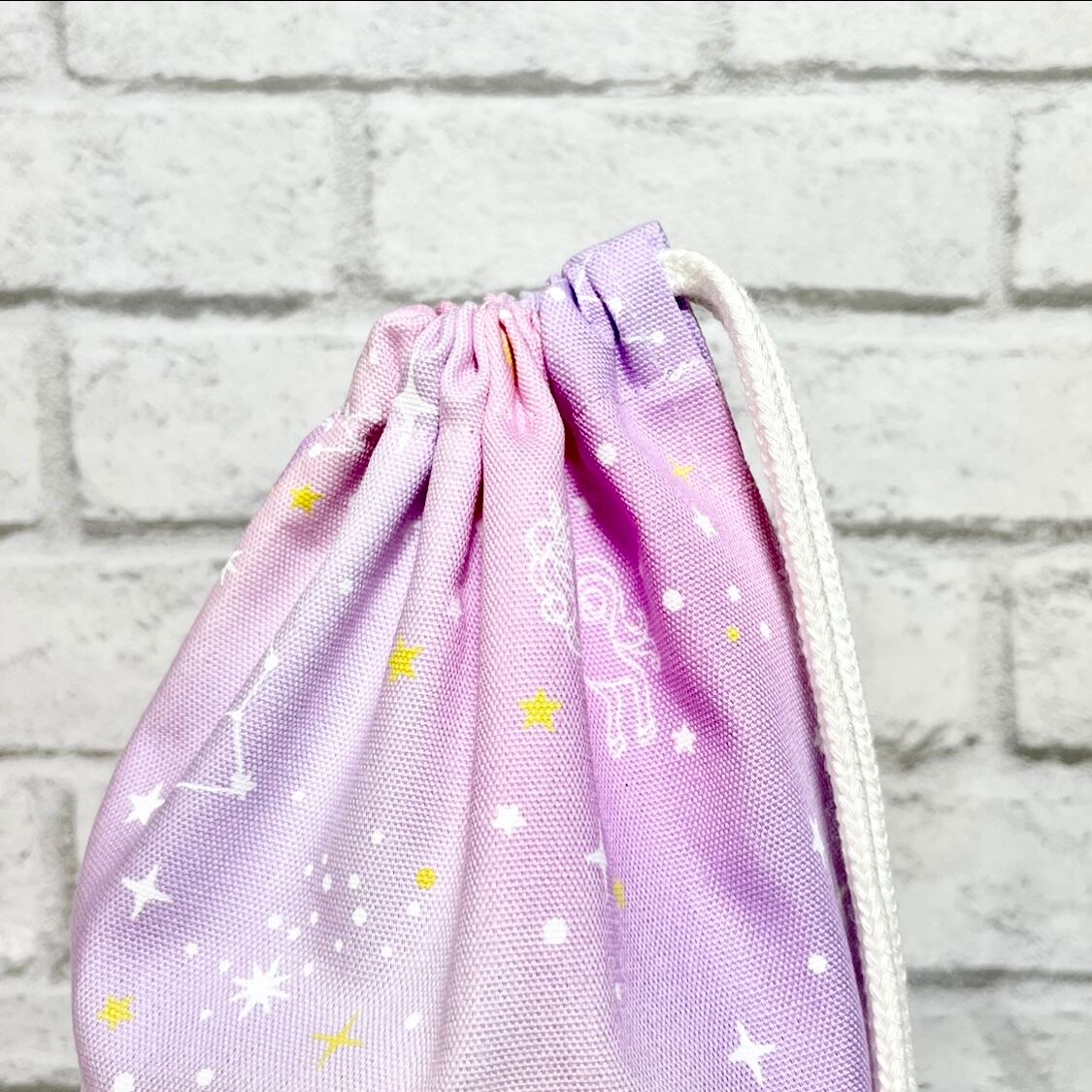 星座とユニコーンをモチーフにしたピンクのデザインが、夢の世界を感じさせる印象を与えるコップ袋です。