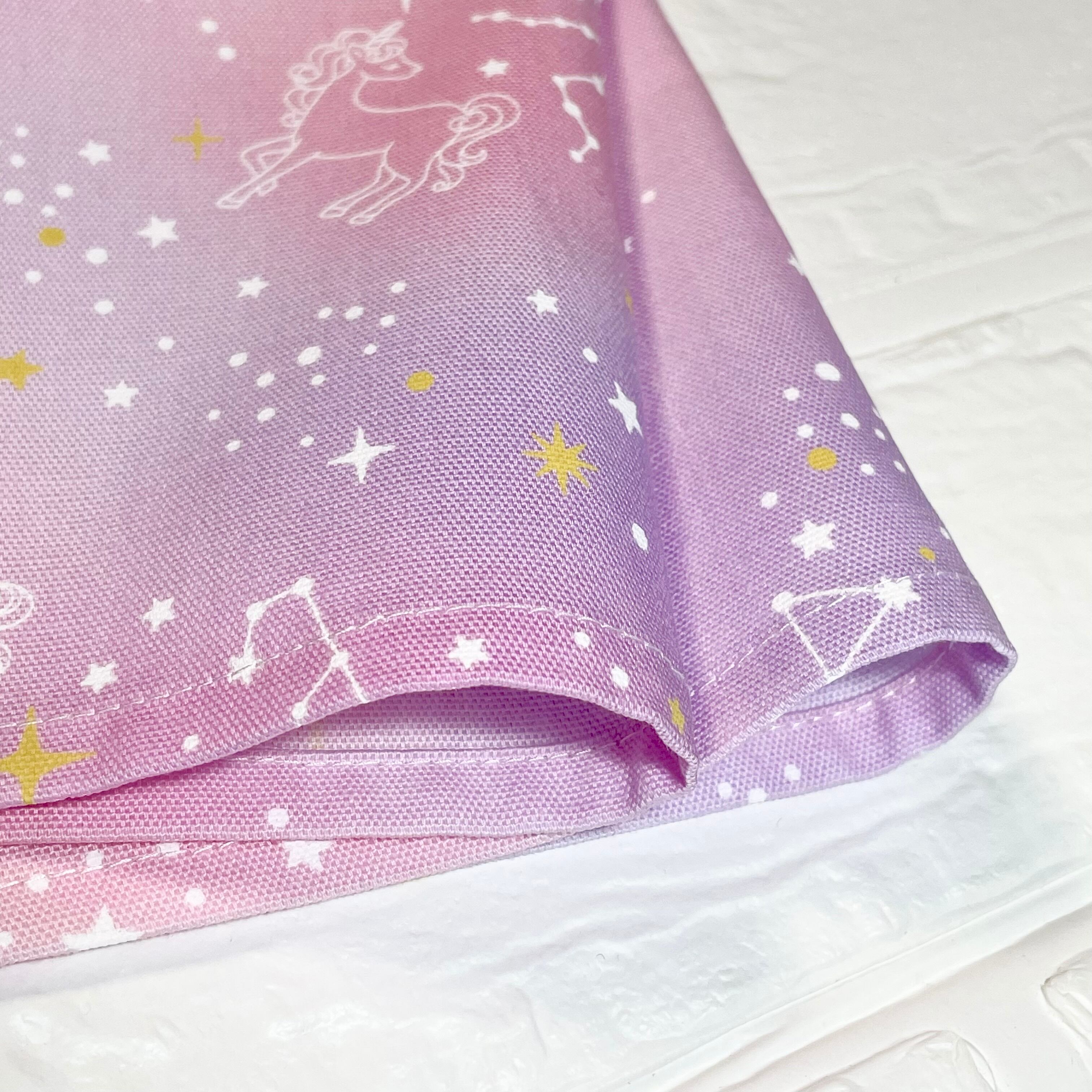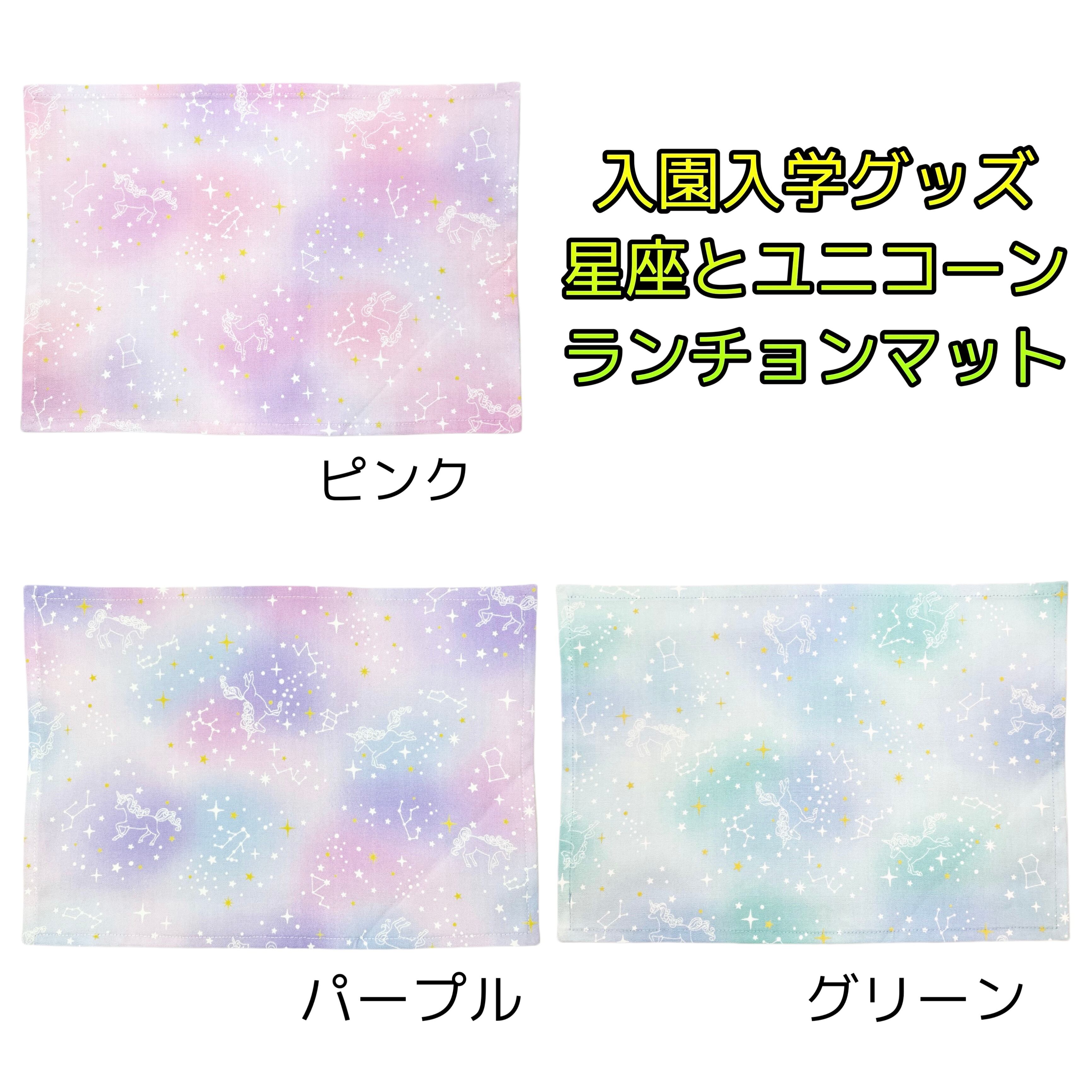 星座とユニコーンをモチーフにしたピンクのデザインが、夢の世界を感じさせる印象を与えるランチョンマットです。