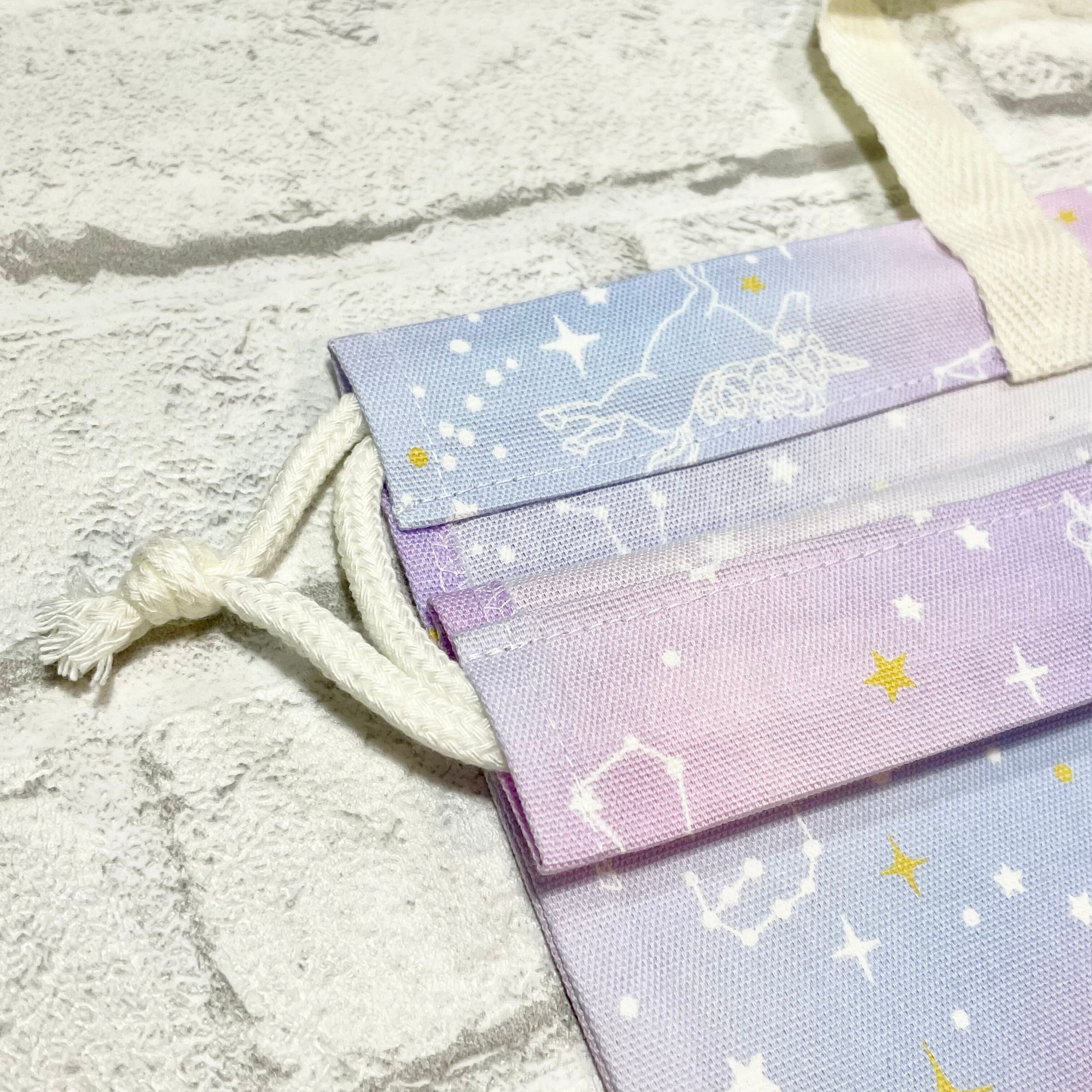 星座とユニコーンをモチーフにしたパープルとラベンダーのデザインが、夢の世界を感じさせる印象を与えるお道具袋です。