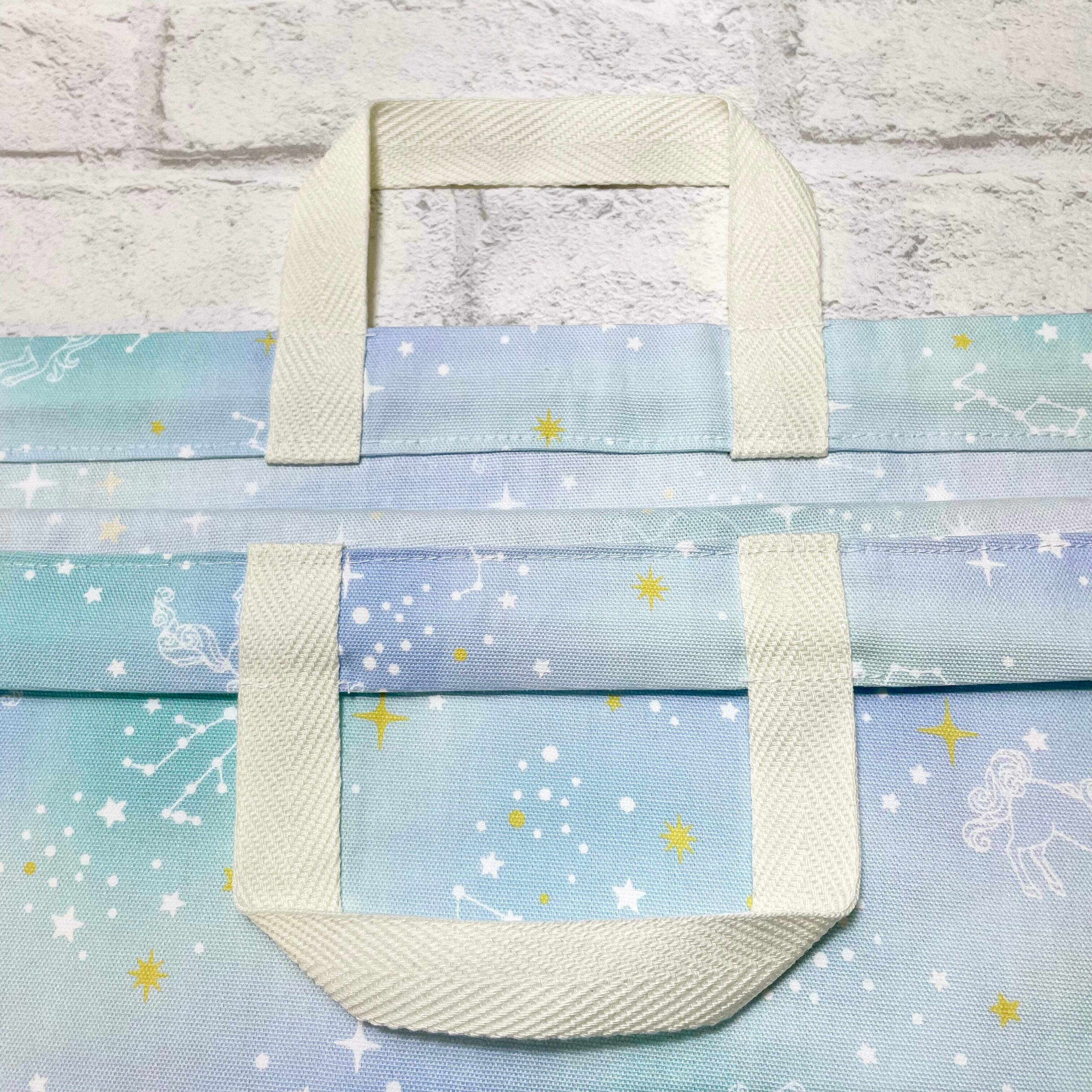 星座とユニコーンをモチーフにしたグリーンとターコイズブルーのデザインが、夢の世界を感じさせる印象を与える持ち手付き体操着袋です。