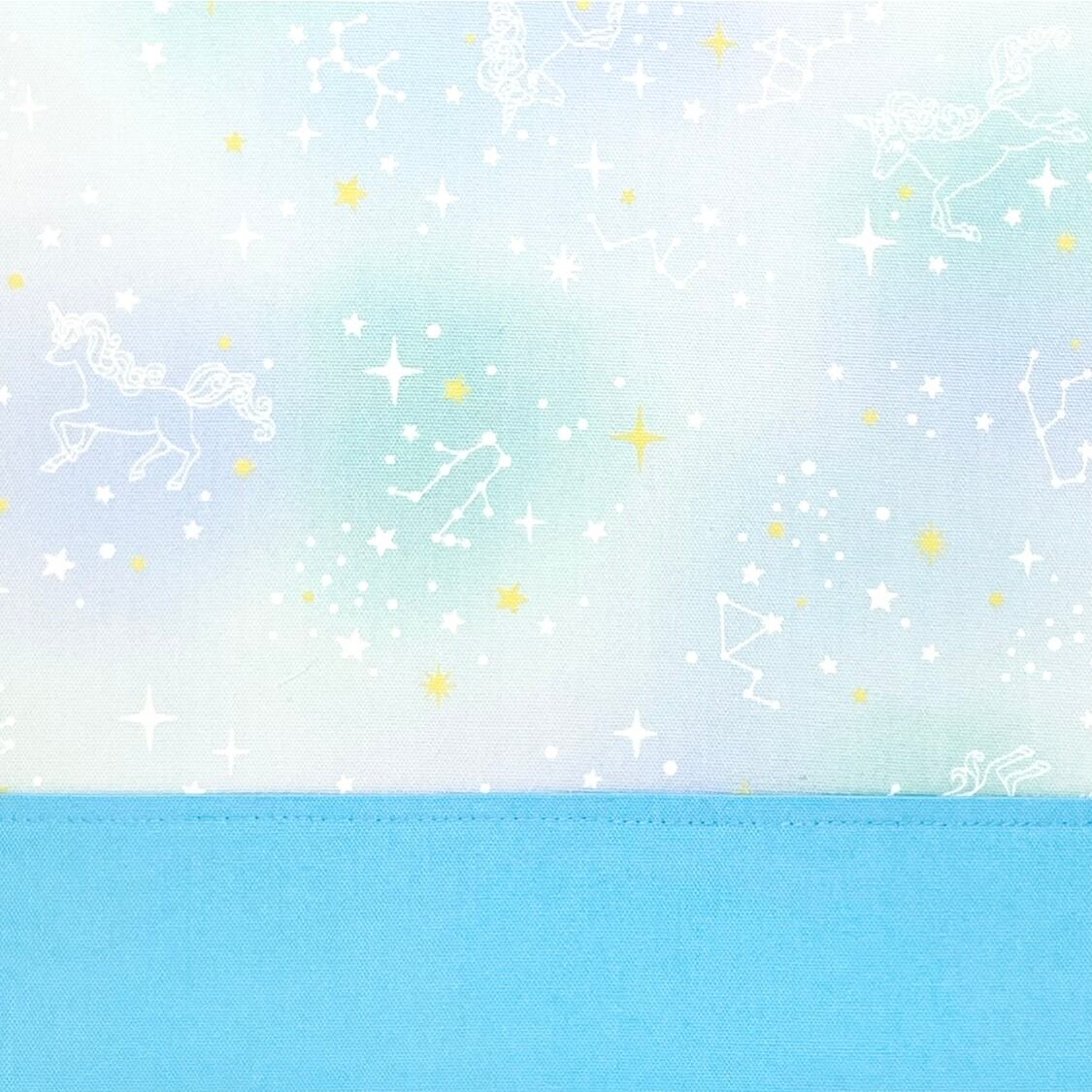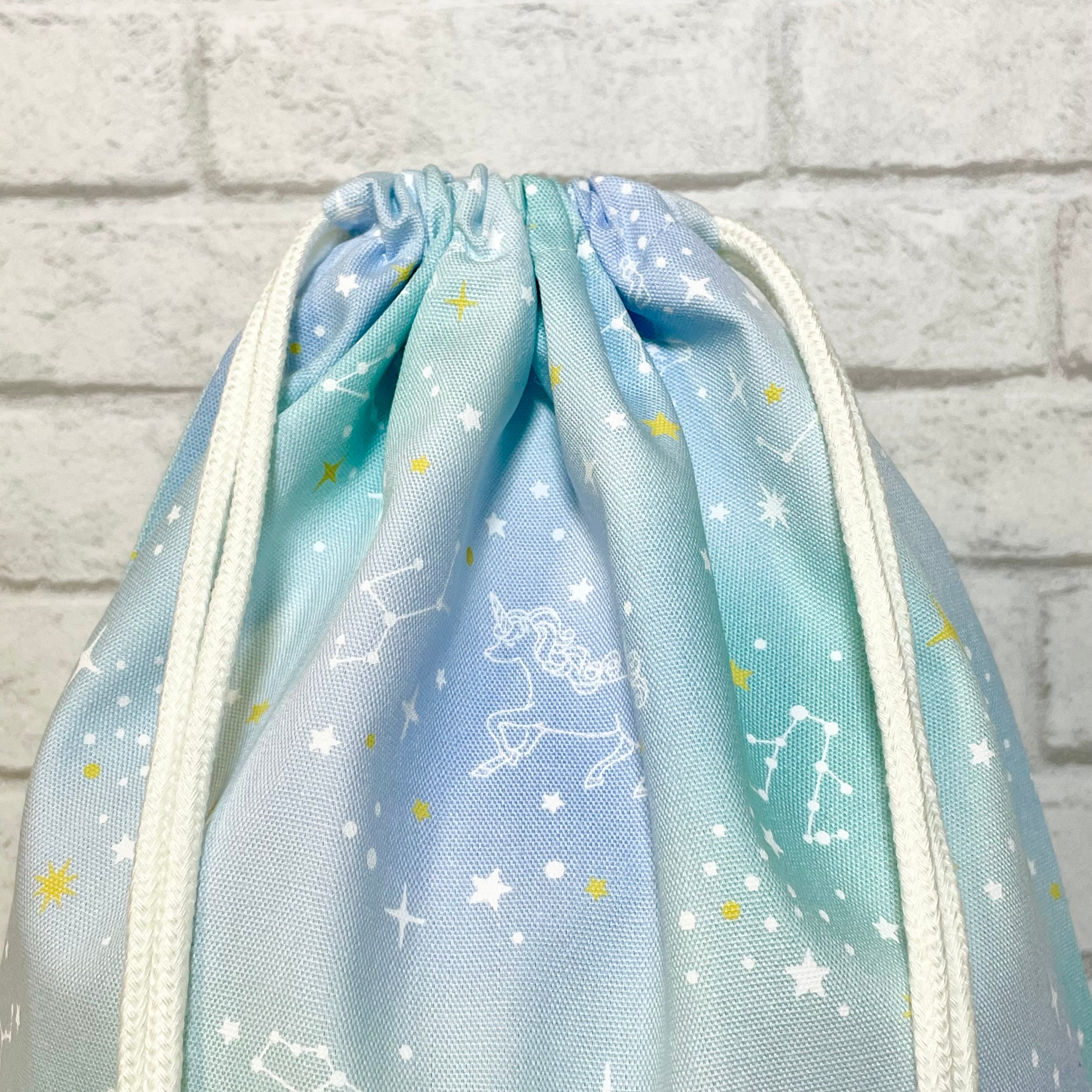 星座とユニコーンをモチーフにしたグリーンとターコイズブルーのデザインが、夢の世界を感じさせる印象を与える体操着袋です。