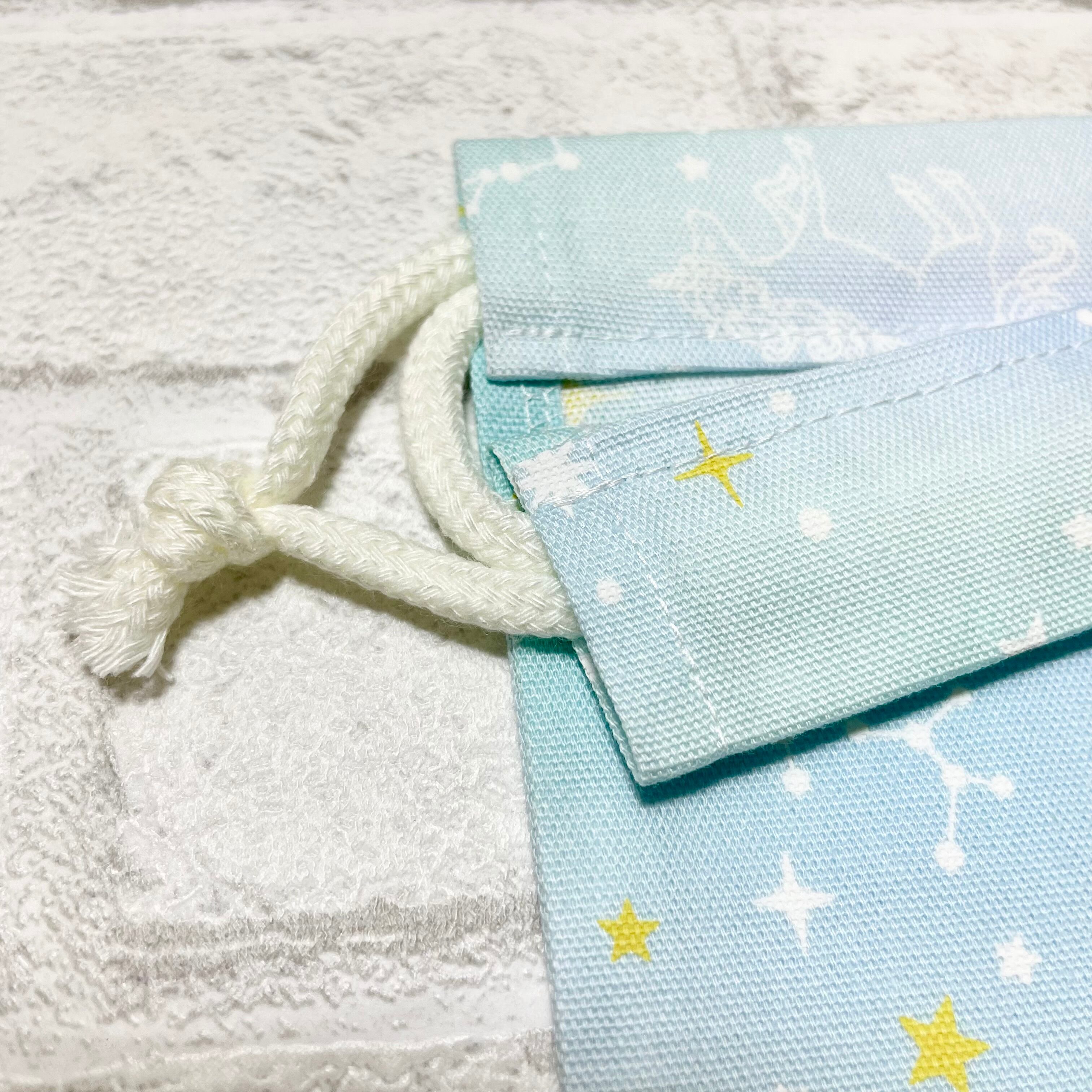 星座とユニコーンをモチーフにしたグリーンとターコイズブルーのデザインが、夢の世界を感じさせる印象を与えるお弁当袋です。