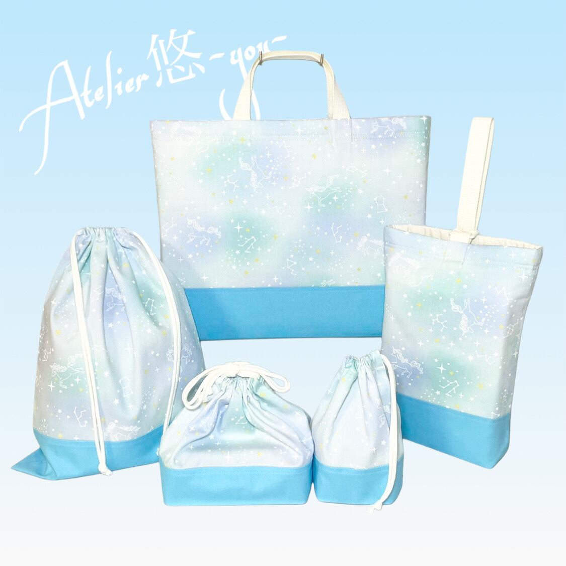 星座とユニコーンをモチーフにしたグリーンとターコイズブルーのデザインが、夢の世界を感じさせる印象を与えるコップ袋です。